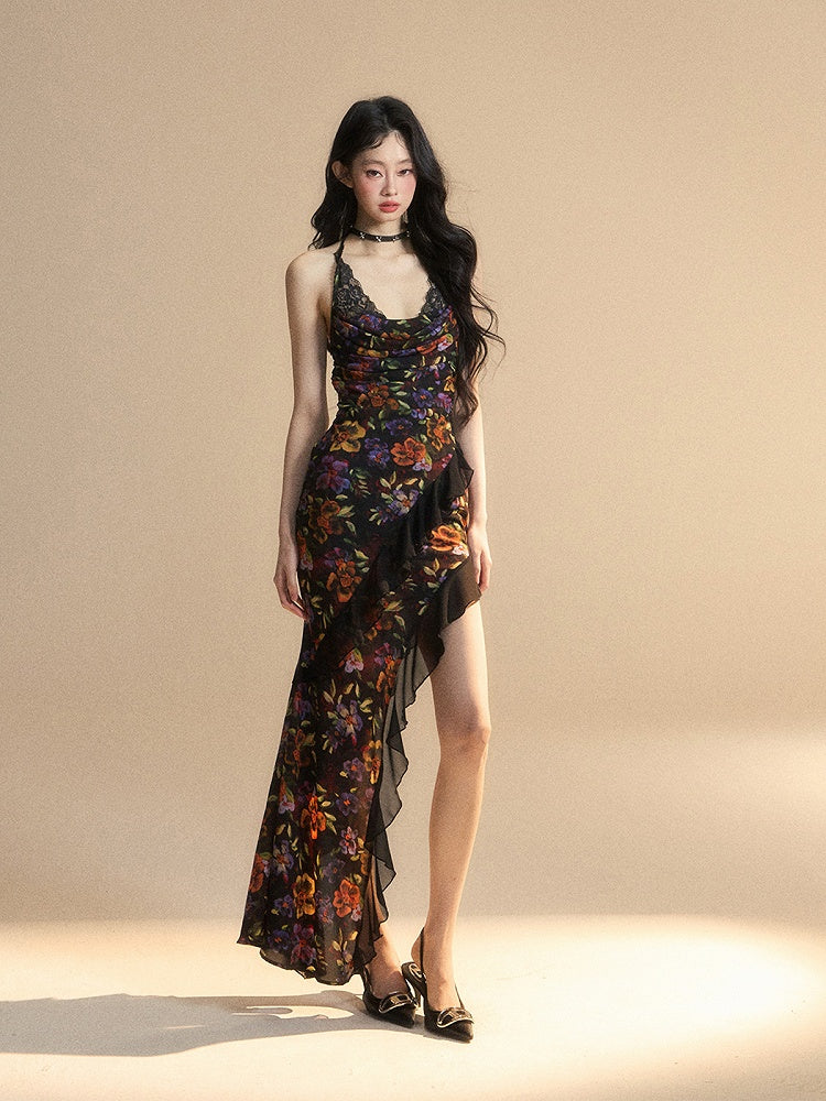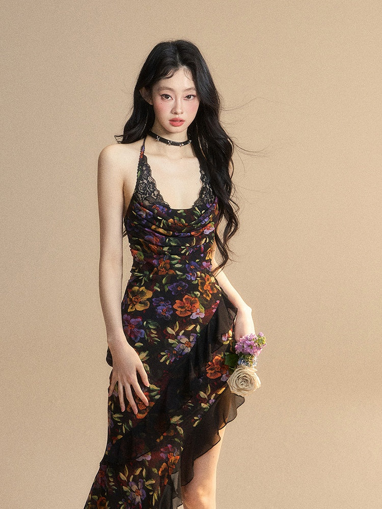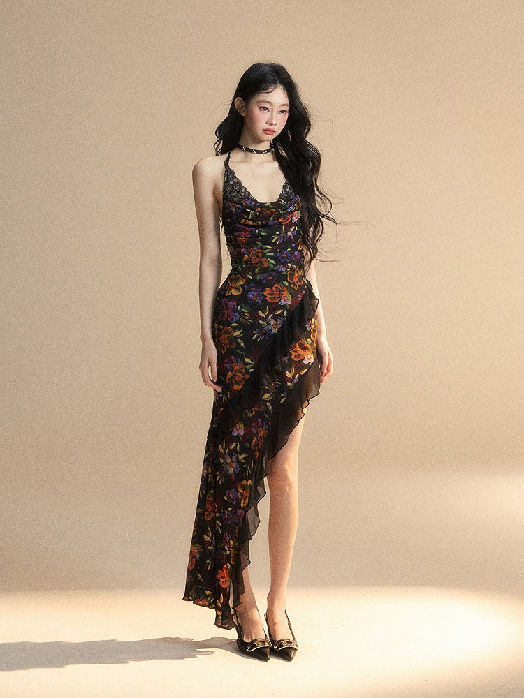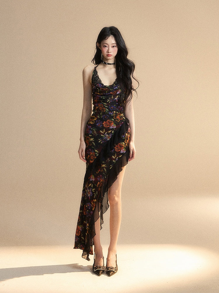 Schwarzes Chiffon Neckholder Asymmetrischer Meerjungfrauenrock Blumenkleid