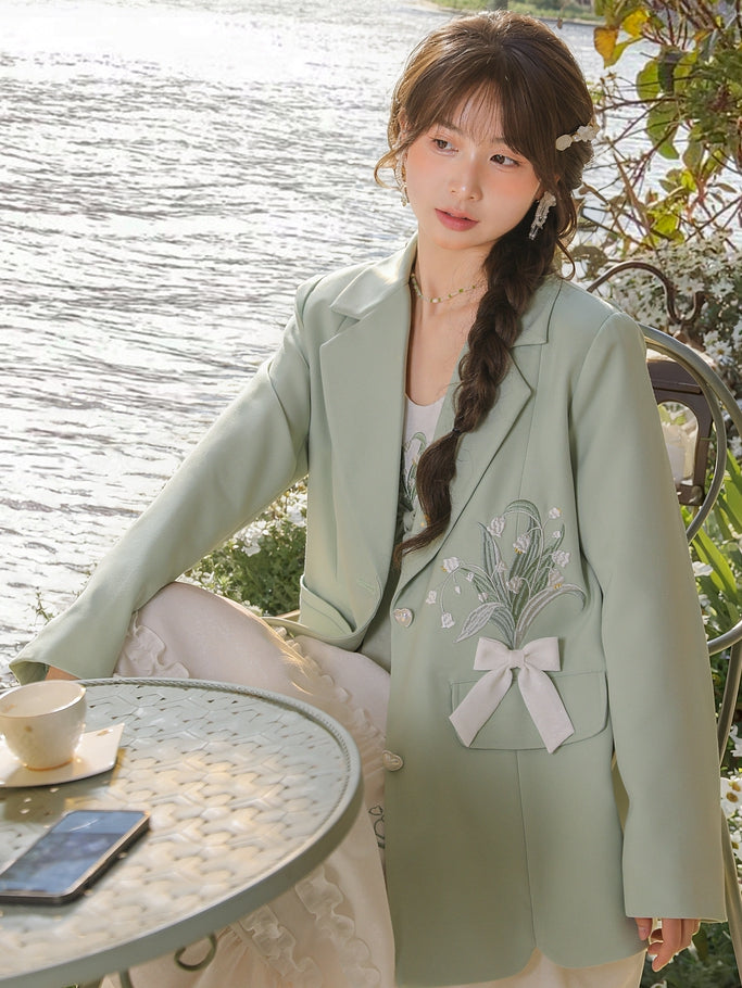 Blazer mit Blumenstickerei und grünen herzförmigen Knöpfen