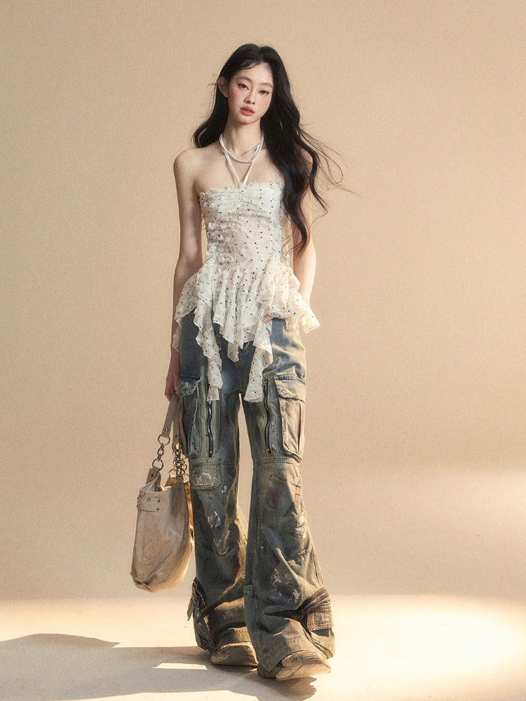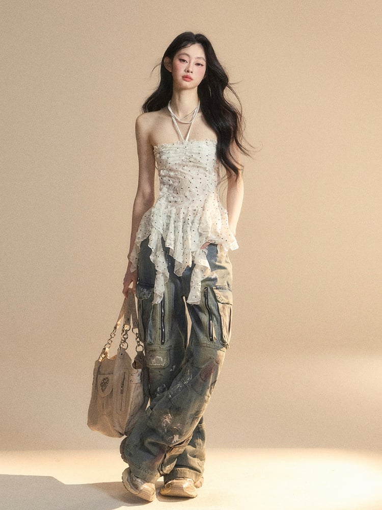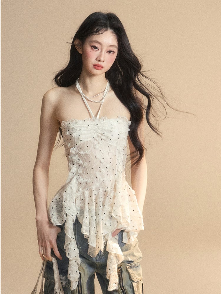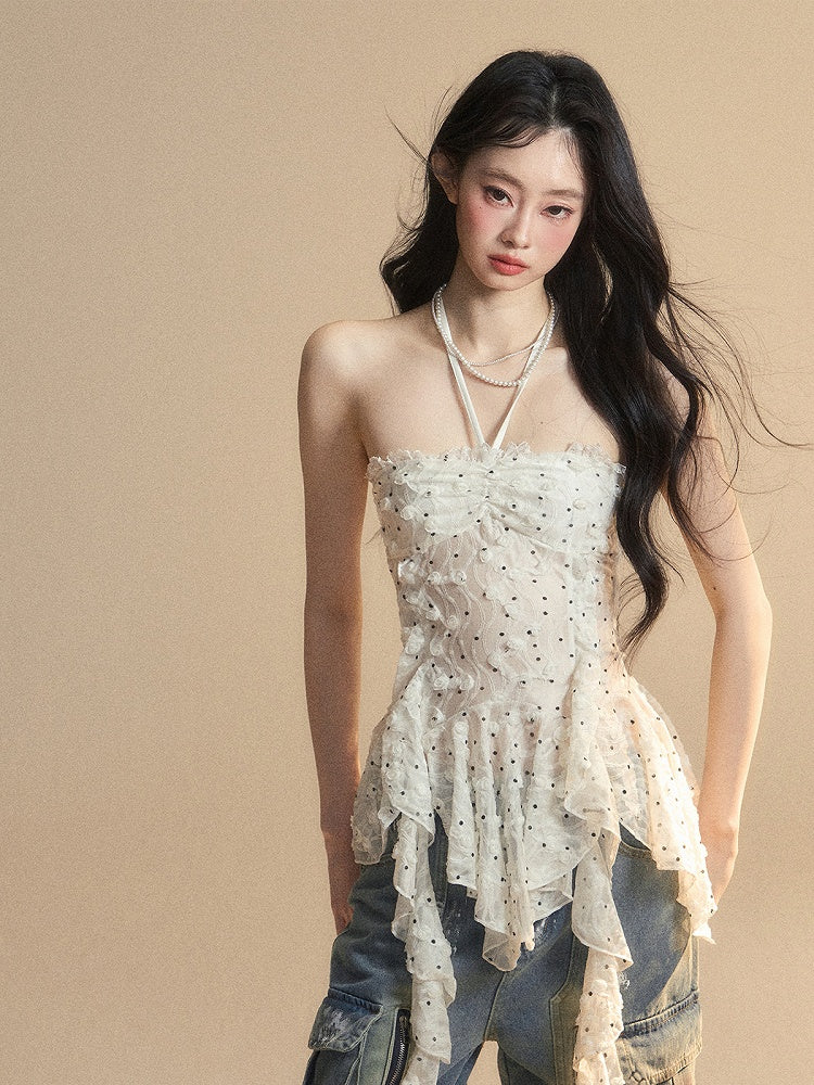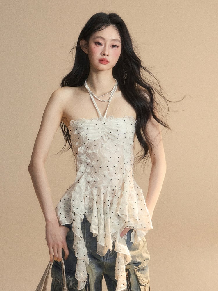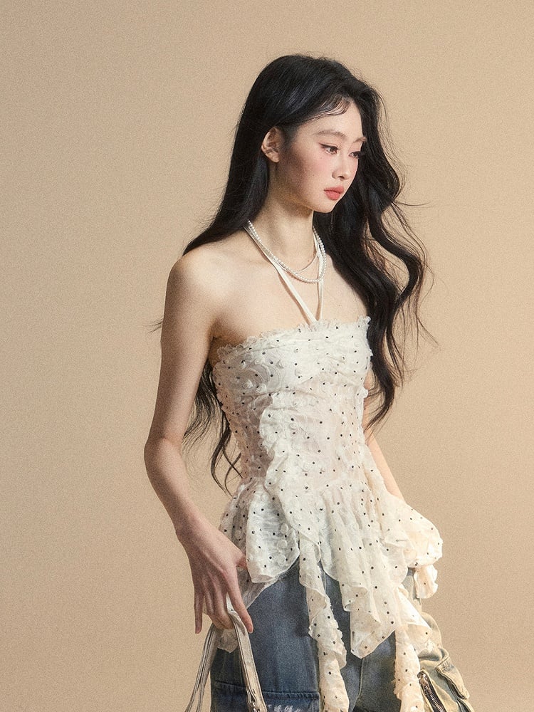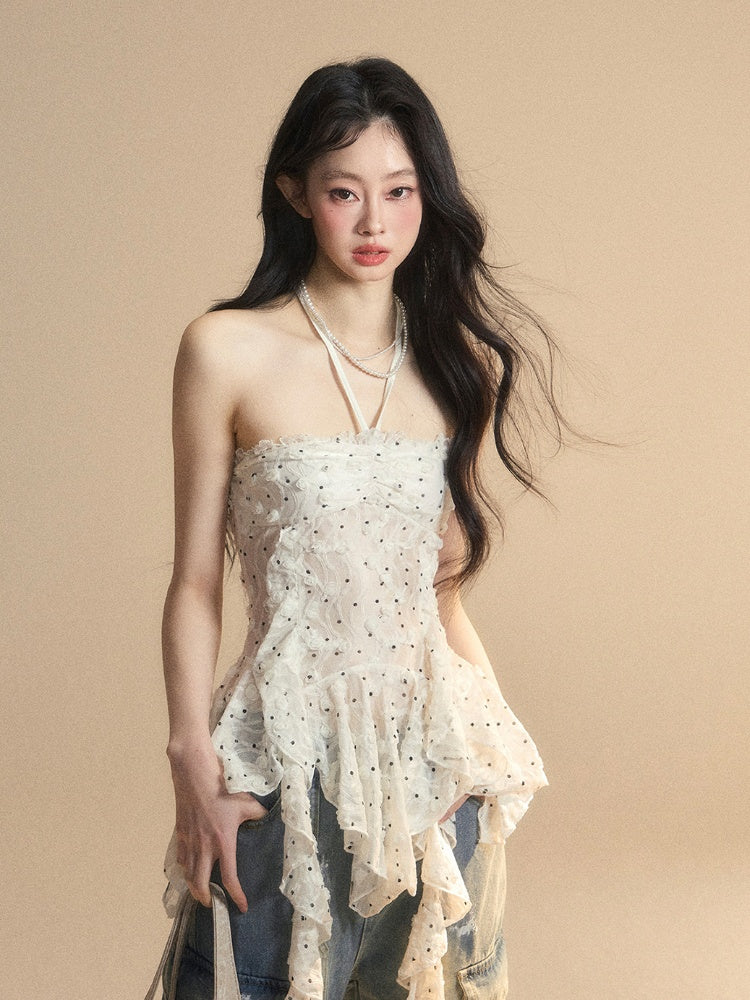 Neckholder-Trägerloses Top mit Tupfenmuster und asymmetrischem Volantsaum in Weiß
