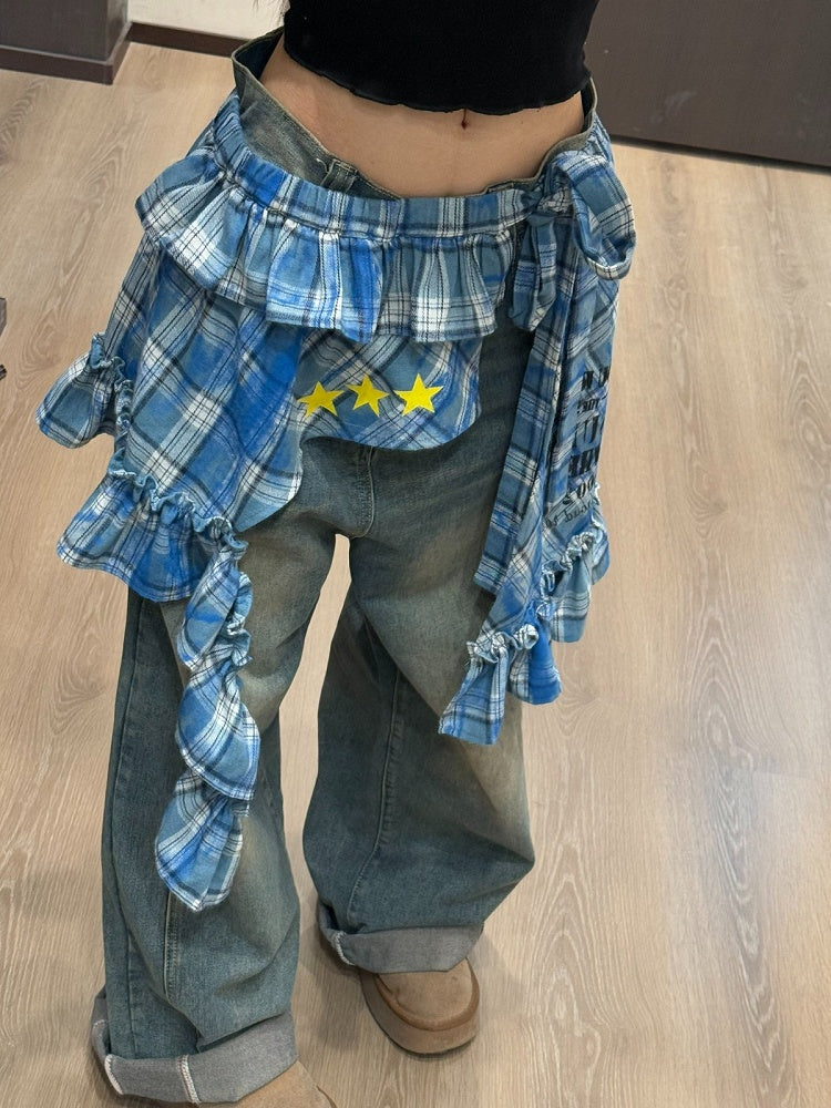 Blue Retro Flounce Hem Self-tie Apron Skirt with Plaid Pattern and Star Embellishments