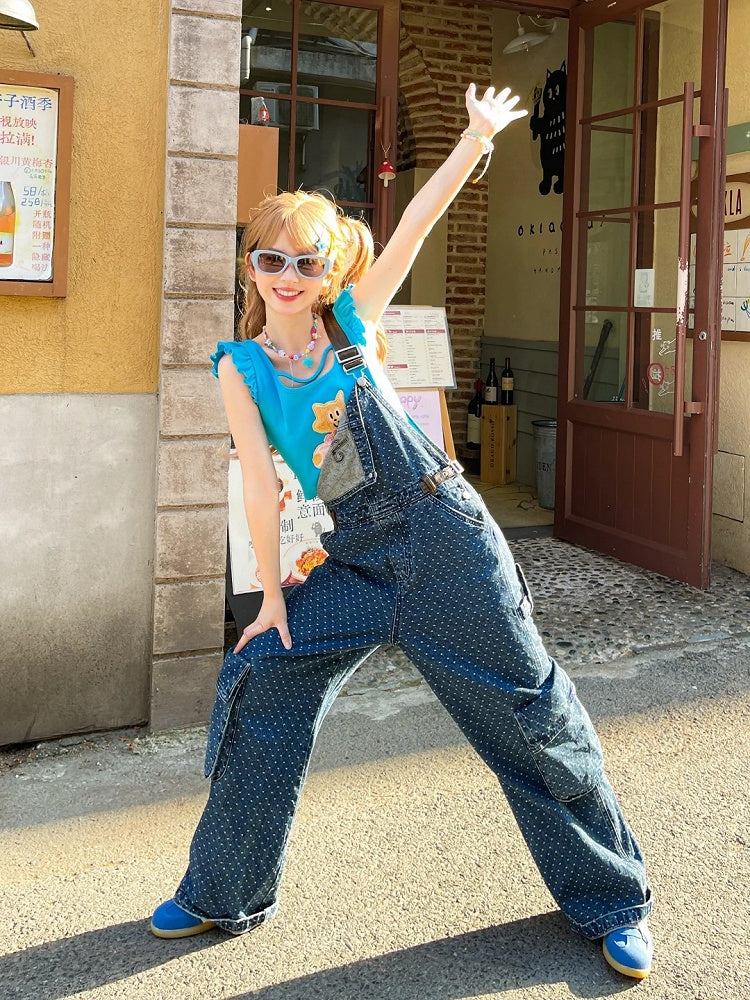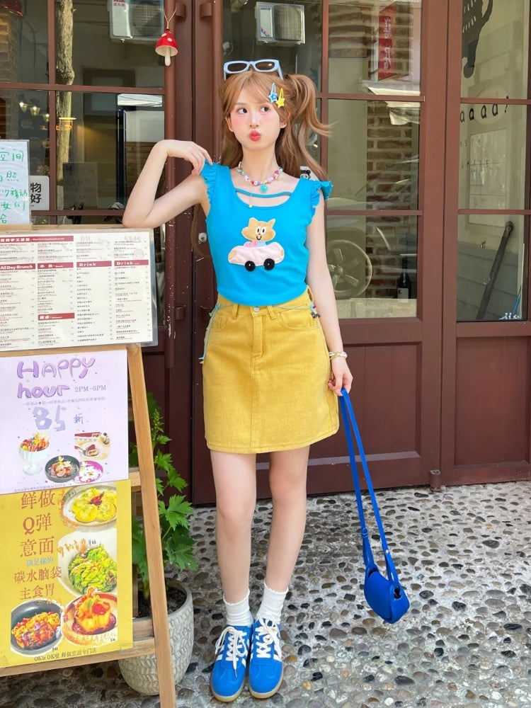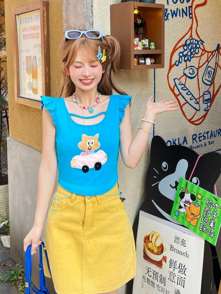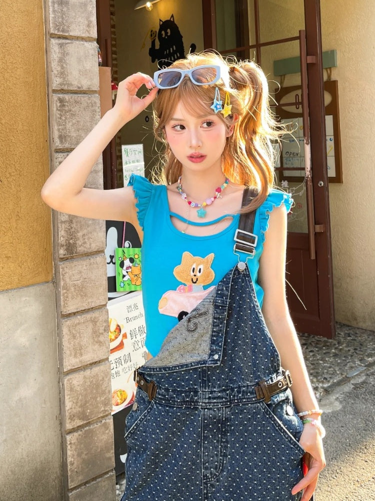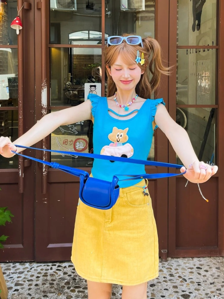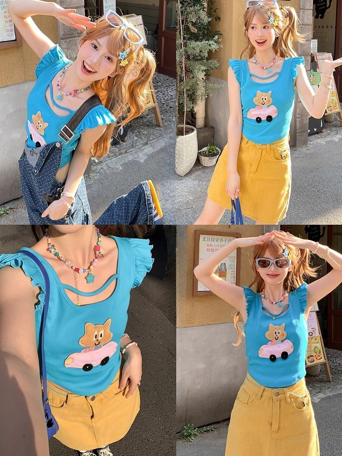 Free Kitty Applique Flatterärmel Top Blau Süße Halskette mit
