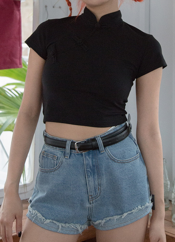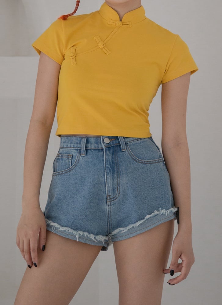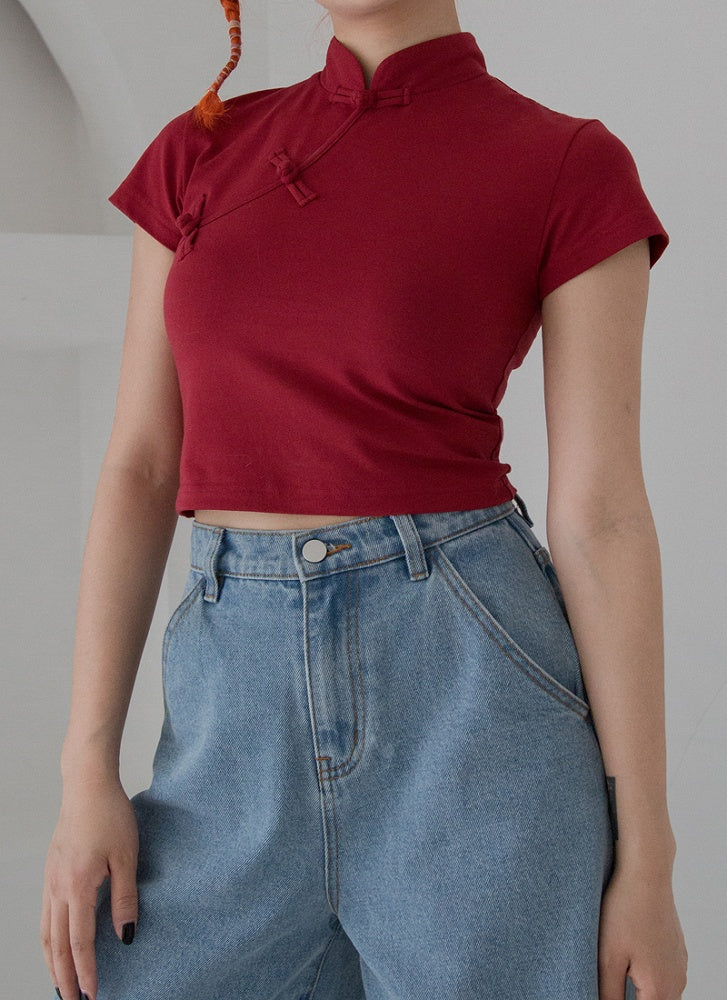 Kurzes T-Shirt im Cheongsam-Stil mit Mandarinkragen und Froschknöpfen – erhältlich in 5 Farben