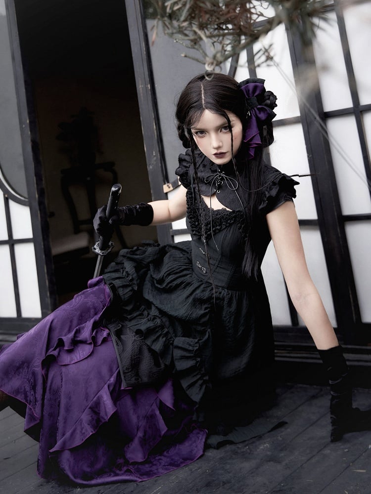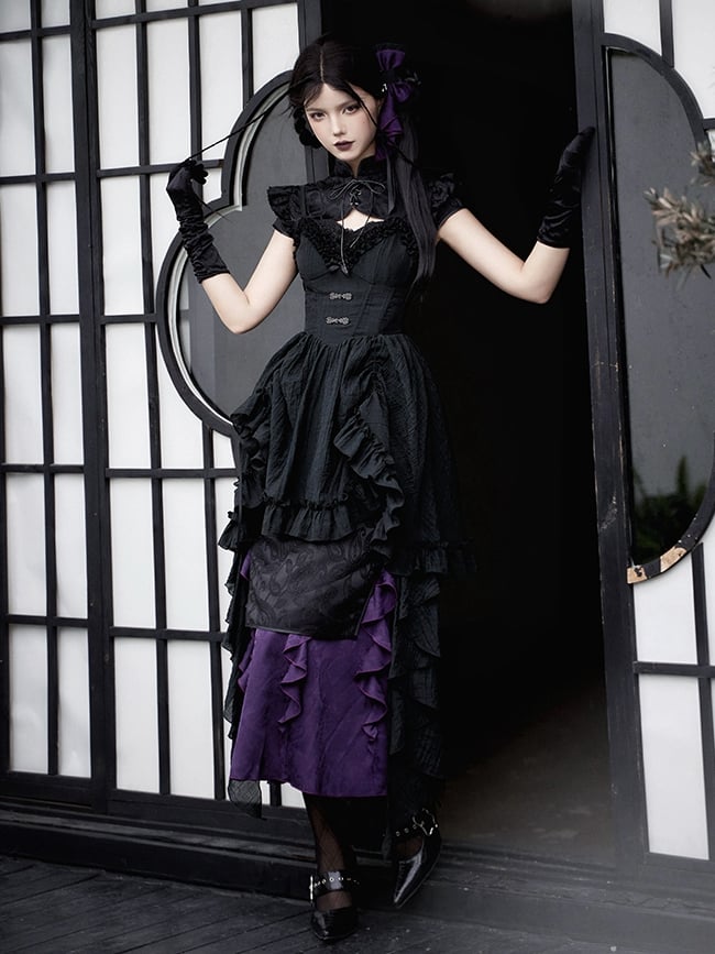 Voller Jacquard-Saum Qi Rüschen Set Schwarz Qipao Cthulhu Lolita Kleid Vibes Lila Trim Cascading