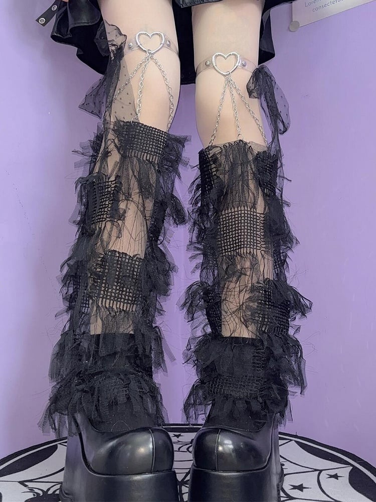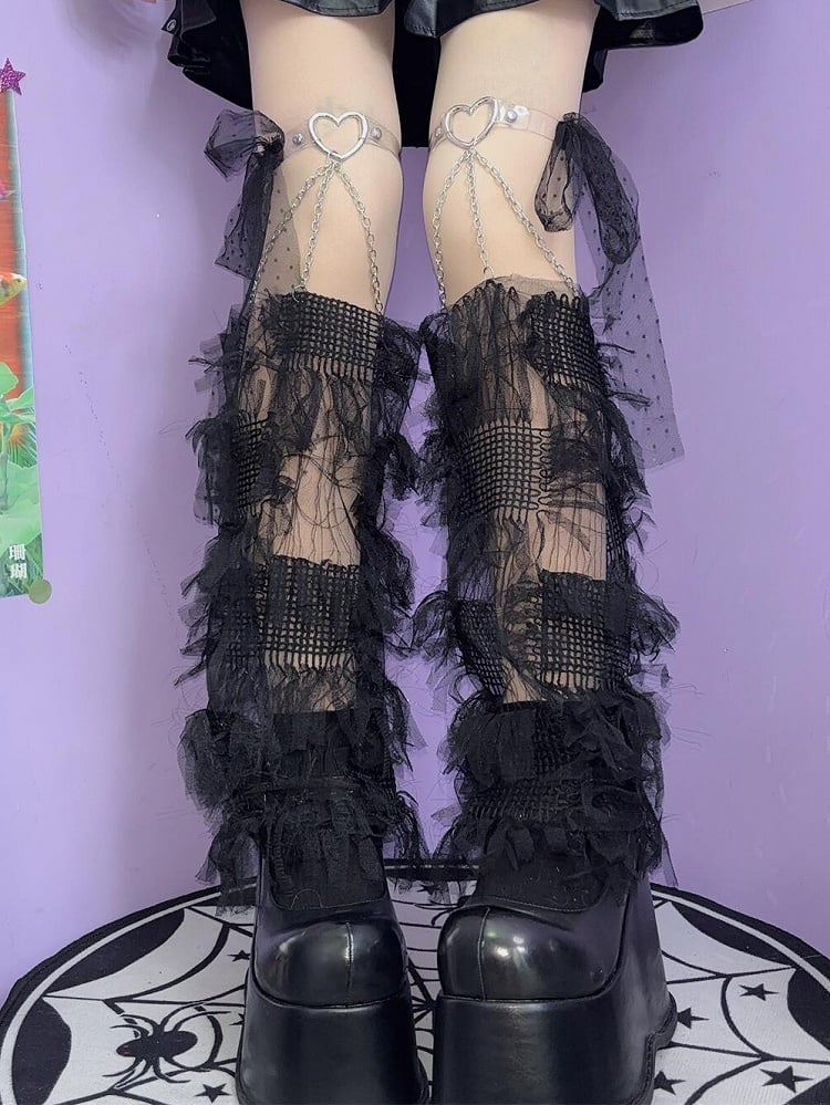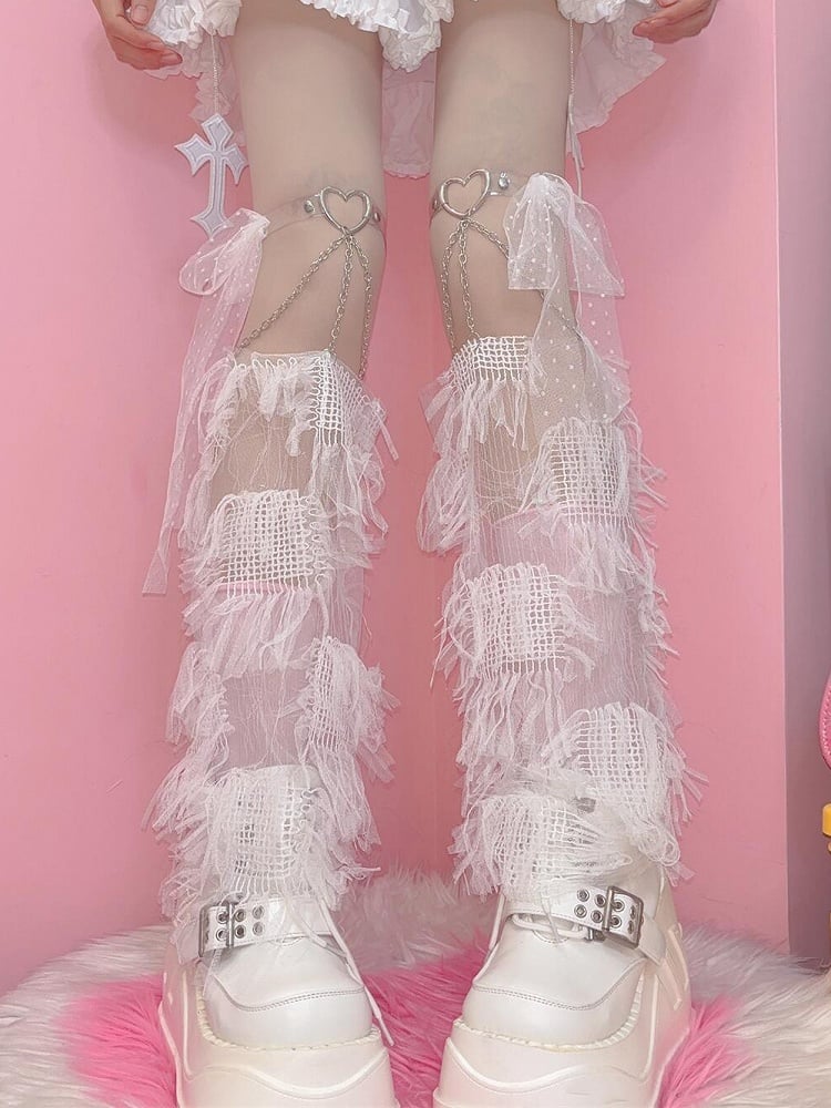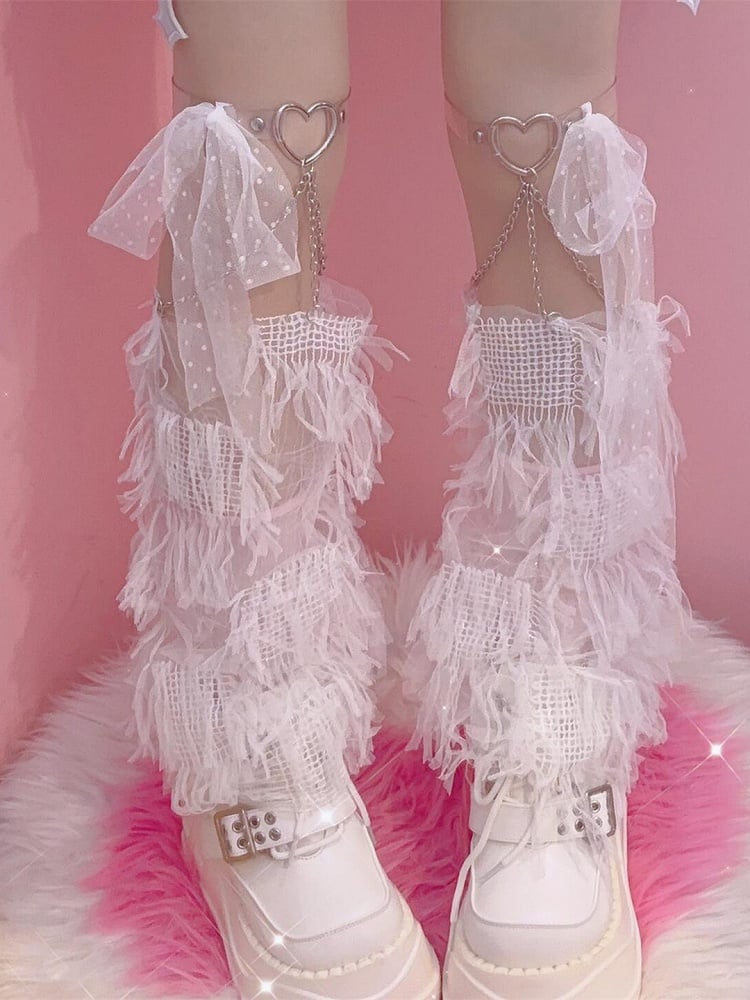 Weiß/Schwarze Y2K-Beinärmel mit Quasten und selbstbindenden Riemen, verziert mit Herz-Strumpfbändern