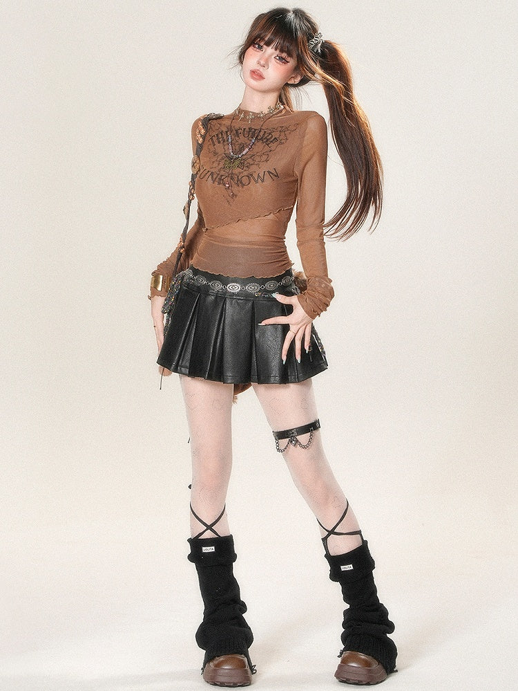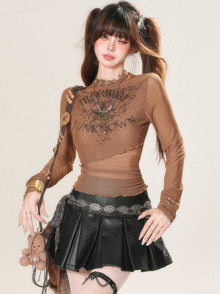 Braunes, Bittersweet Glamorous Langarm-Top mit Buchstaben- und Sternenmuster