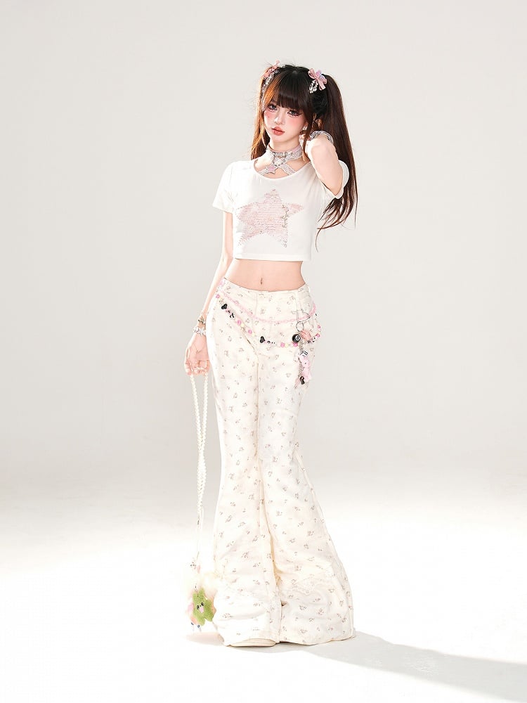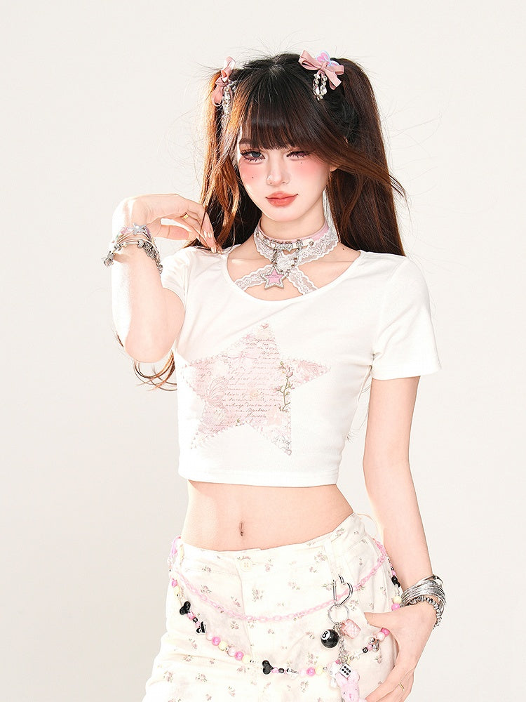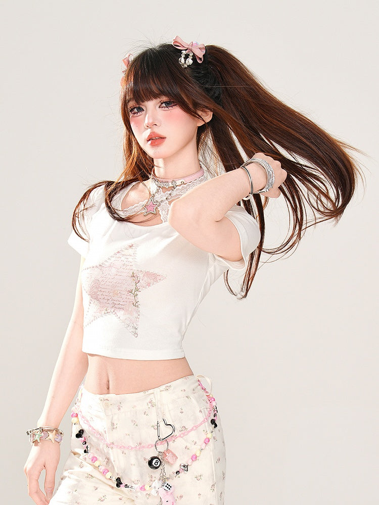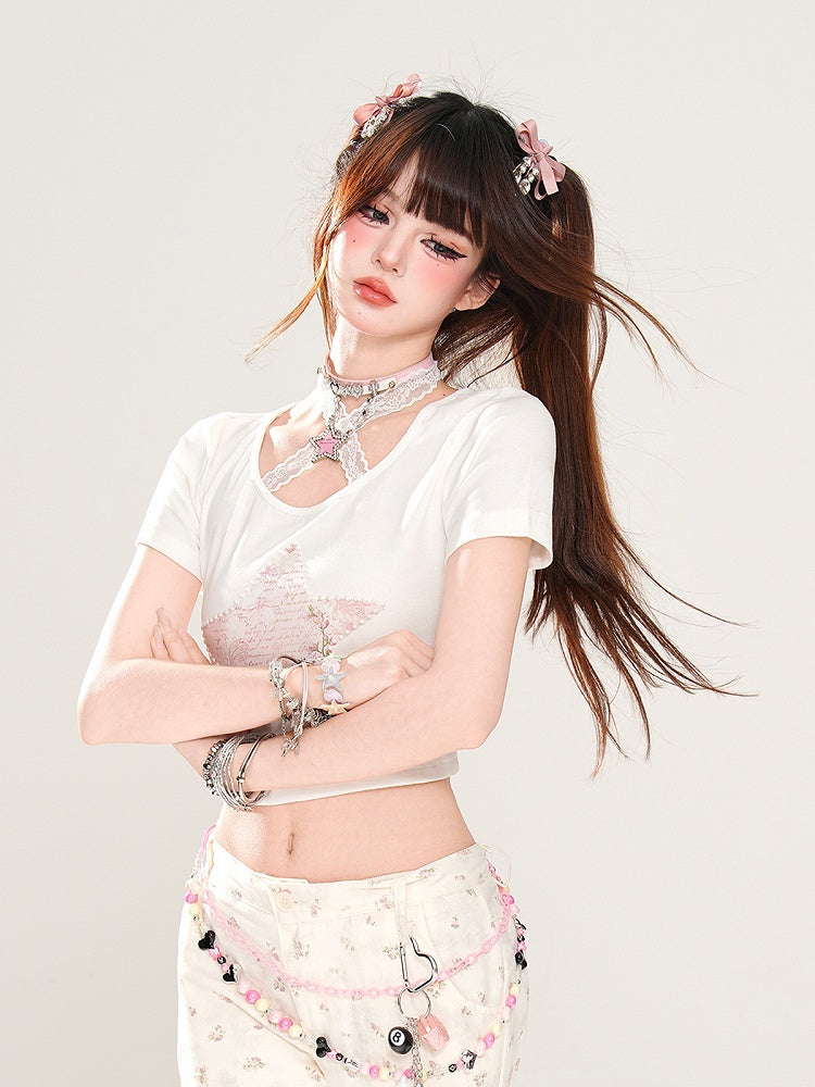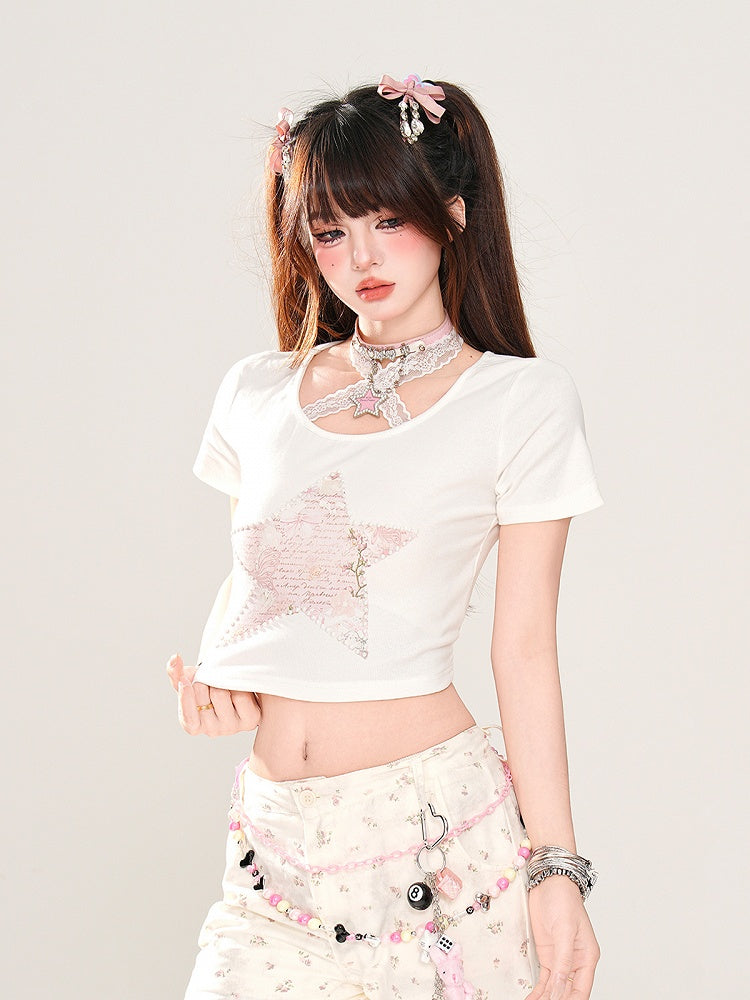 Glamorous Neck – Kurzes weißes Neckholder-T-Shirt aus Spitze mit Sternenprint