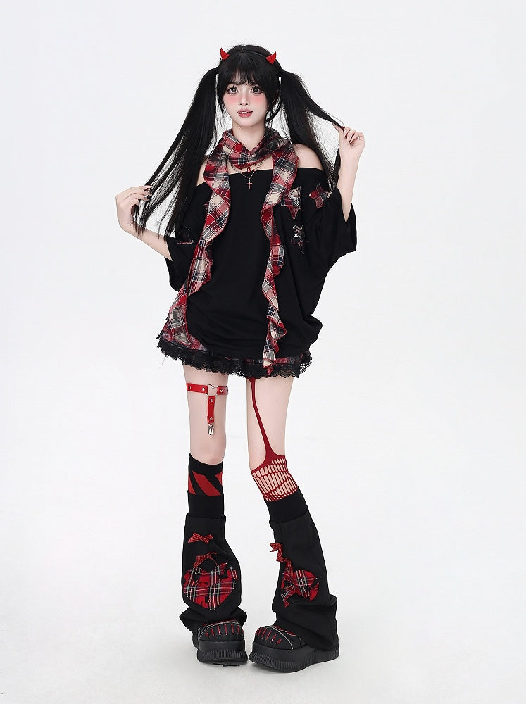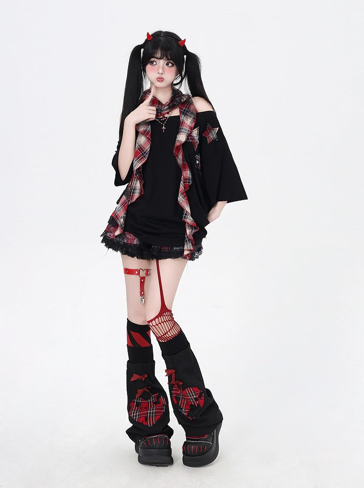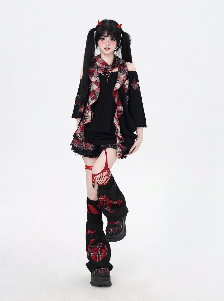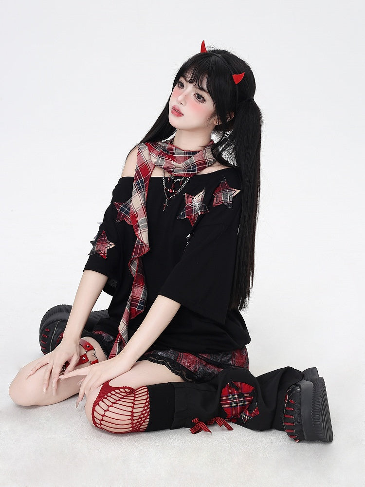 Rot karierte Sternapplikationen Schwarzer asymmetrischer Ausschnitt Glamouröses T-Shirt mit Schal
