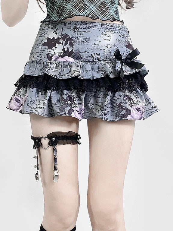 Schwarzer, glamouröser Y2K-Stufenrock mit Spitzenbesatz und Blumen- und Buchstabendruck