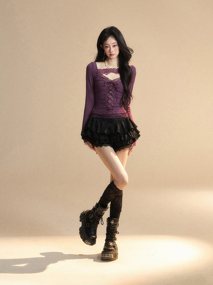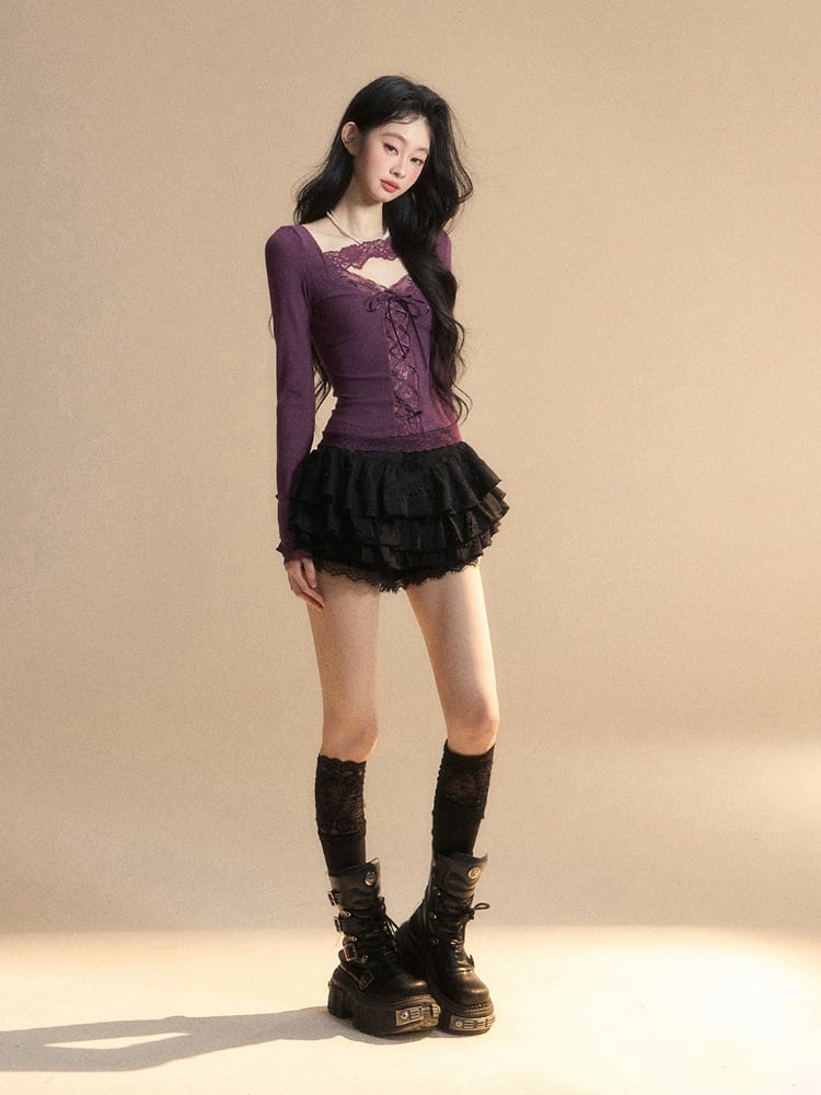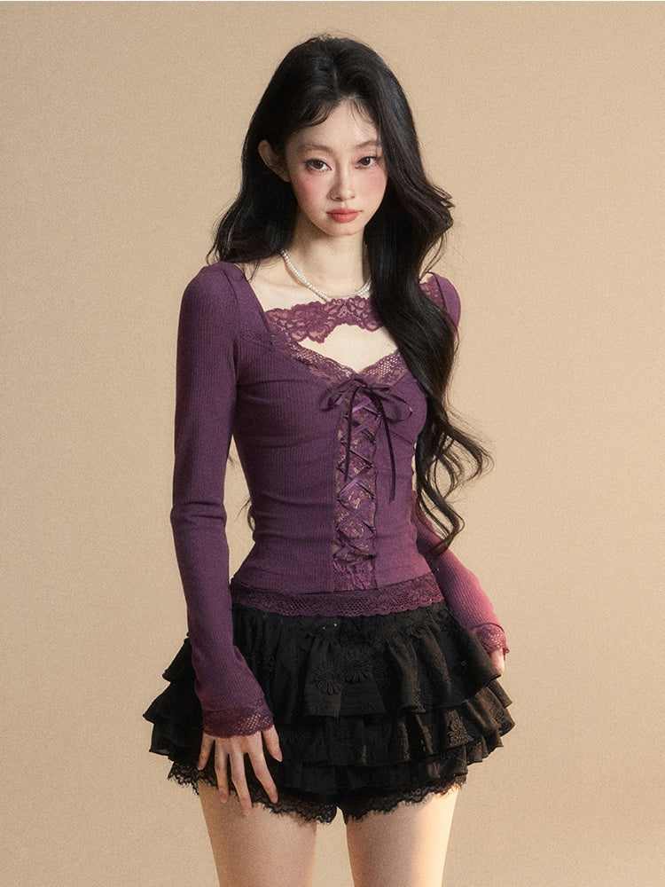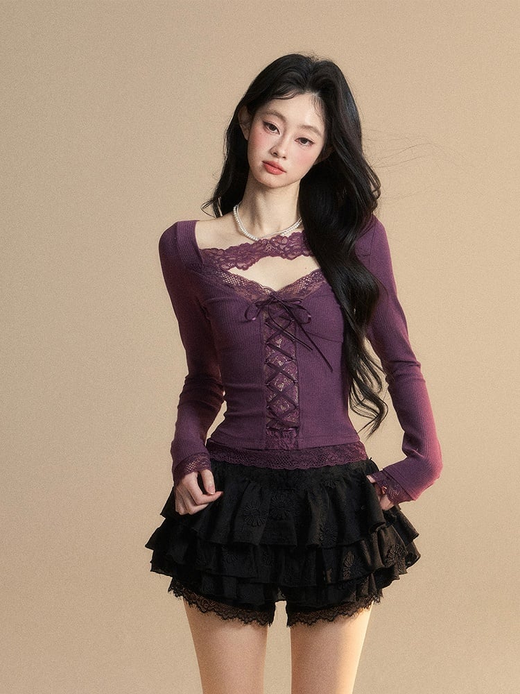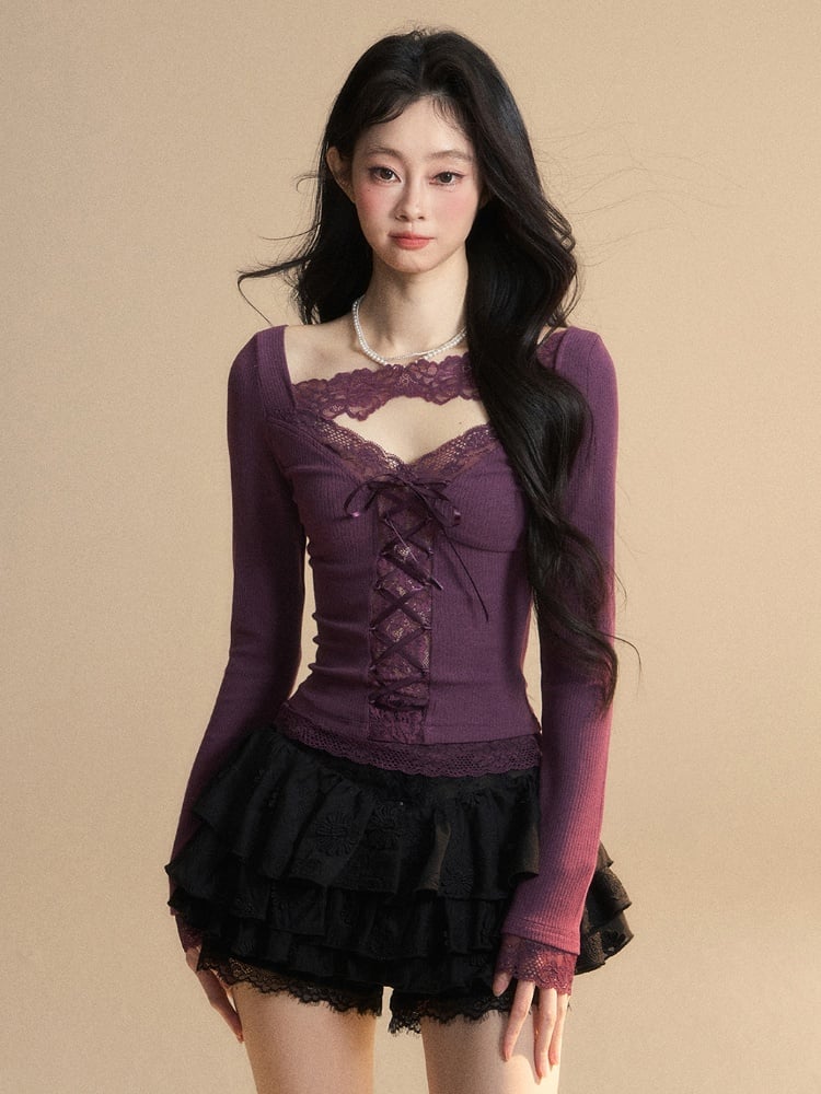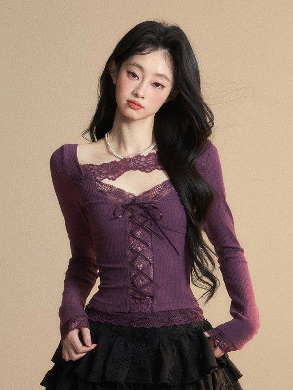 Glamouröses Top mit Schnürung, lila V-Ausschnitt, kontrastierende Spitzenaufnäher vorne