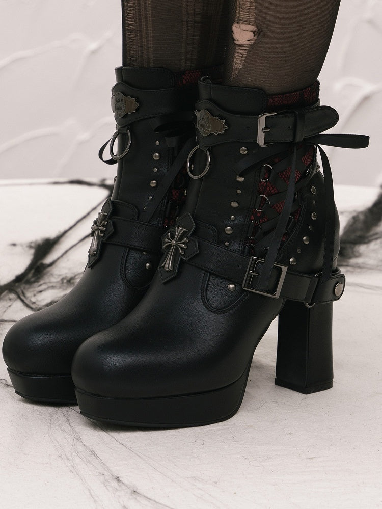 Gothic Lacing Crisscross Studded System PU Dual Black Fastening Boots Details - with High-heel Ankle