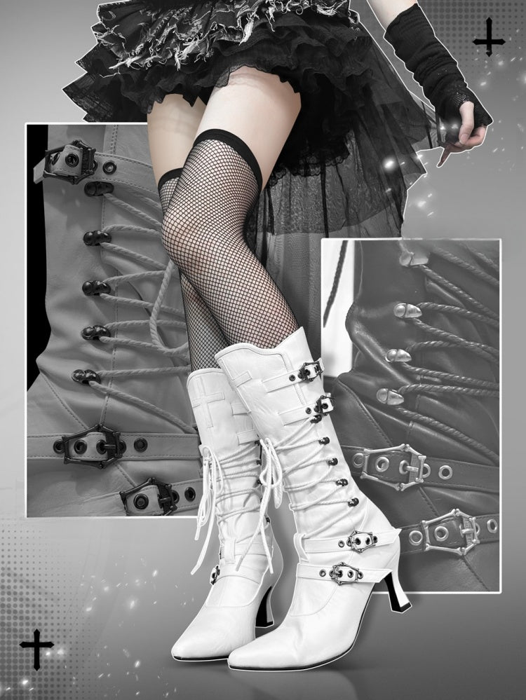 Zeigen Sie Ihre kantige und süße Seite mit unseren weißen Gothic-Stiefeln mit Schnürung und spitzer Zehenpartie. Diese Stiefel zeichnen sich durch raffinierte Schnürdetails, eine spitze Zehenpartie und ein punkinspiriertes Design aus. Werten Sie Ihr Outfit mit diesen stylischen und vielseitigen Stiefeln auf.