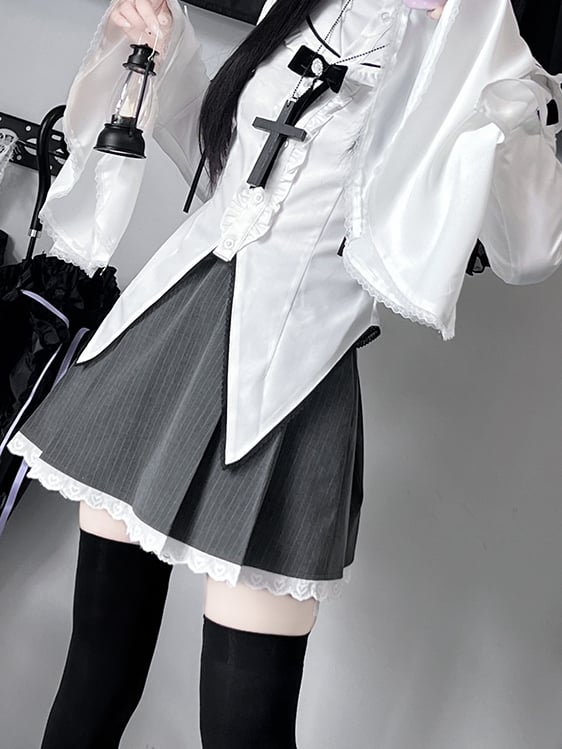 Dieses gotische weiße Hemd mit Matrosenkragen, kombiniert mit einem grauen, gestreiften Rock mit Spitzenbesatz und einem Jirai Kei-Set mit schwarzer Schleife, ist perfekt für jeden Anlass. Der Matrosenkragen verleiht einen Hauch von Charme, während der Spitzenbesatz und die Schleife für einen Hauch von Eleganz sorgen. Betonen Sie Ihre Niedlichkeit mit diesem Set.
