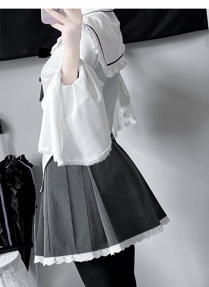 Gothic-Hemd mit weißem Matrosenkragen + grauer Rock mit Spitzenbesatz und einem Jirai-Kei-Set mit schwarzer Schleife