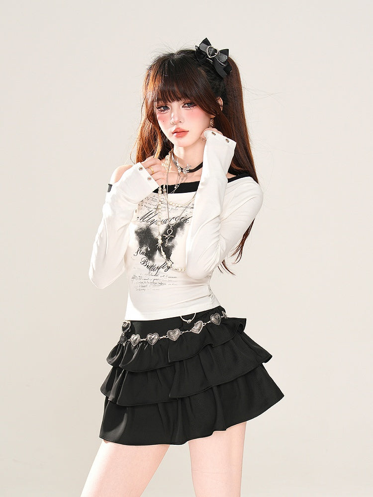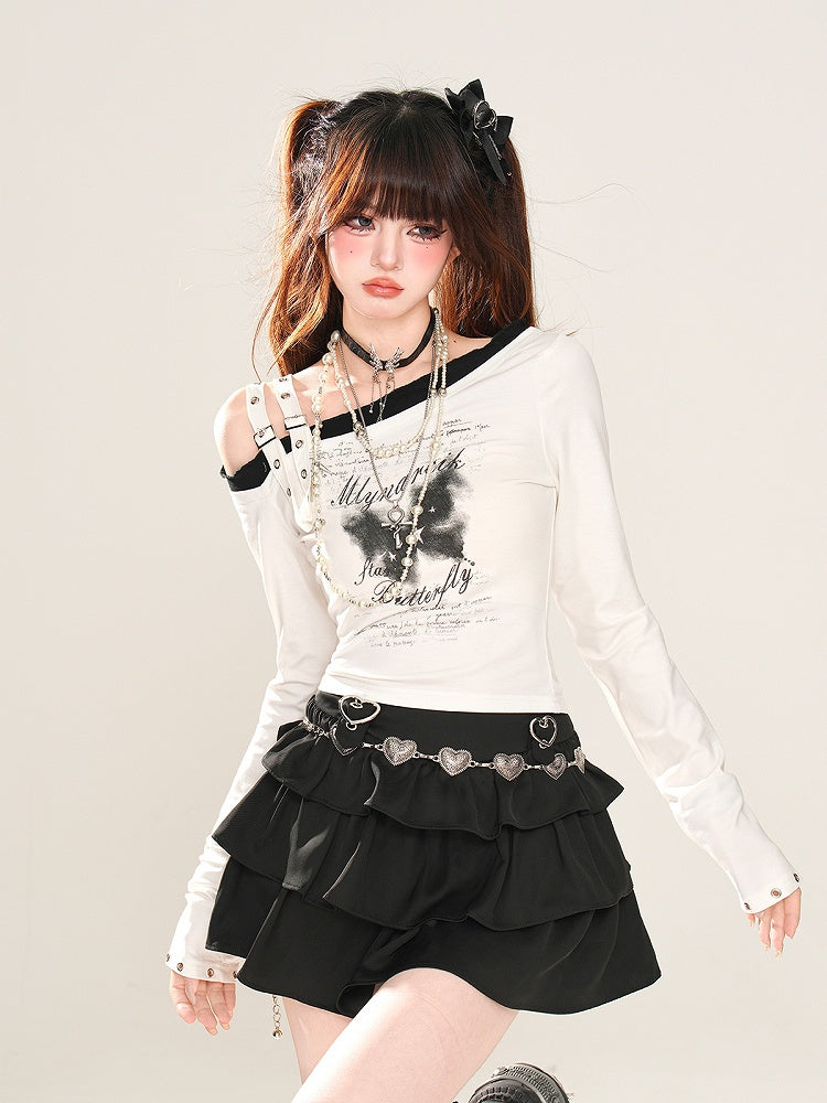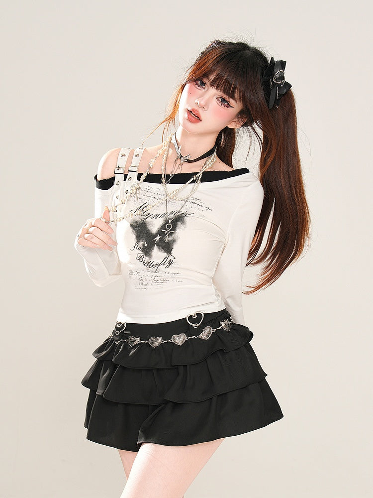 Enigmatic Night Butterfly Schwarz/Weiß Asymmetrischer Ausschnitt Schnallenträger Glamouröses Grafik-Top