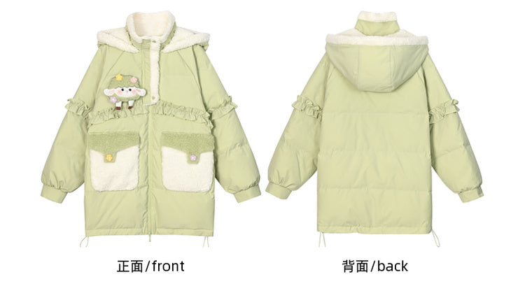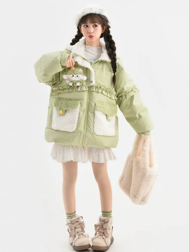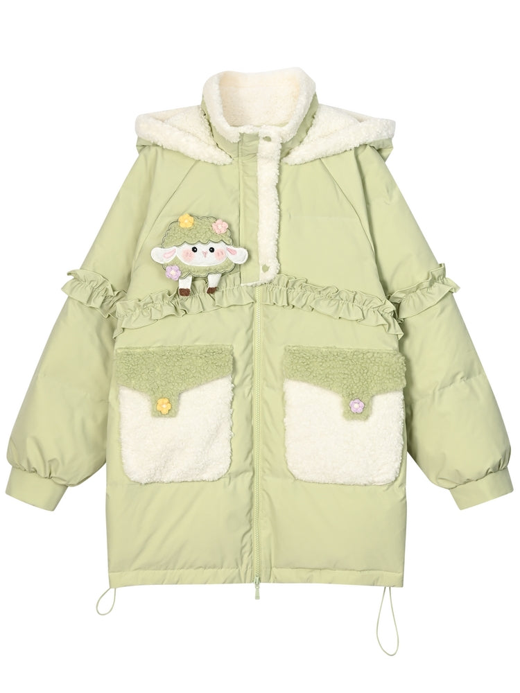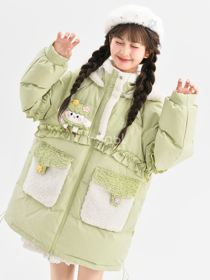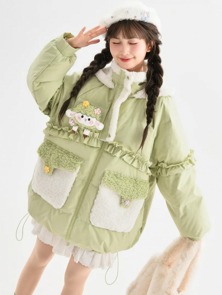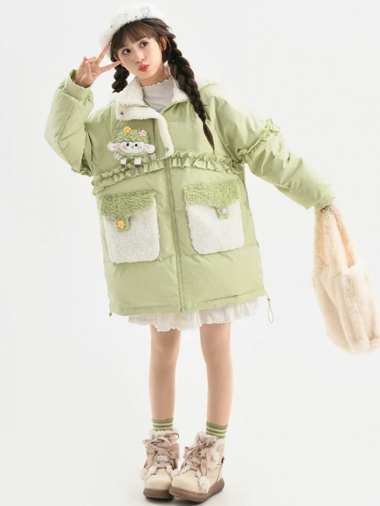Bleiben Sie warm und stilvoll in unserem grünen Daunenmantel mit Kapuze und Rüschenbesatz! Das charmante Lamm-Design verleiht dem Mantel einen Hauch von Niedlichkeit, während die Kapuze und der Rüschenbesatz für zusätzliche Wärme und Eleganz sorgen. Perfekt für kühle Tage – dieser Mantel hält Sie kuschelig und bezaubernd.
