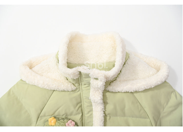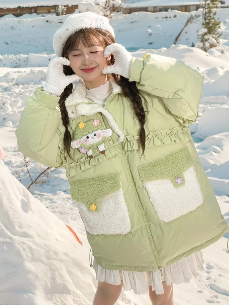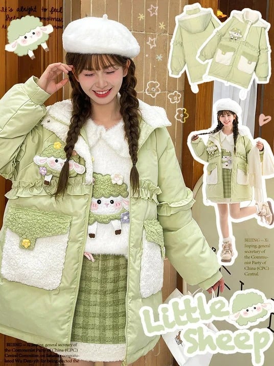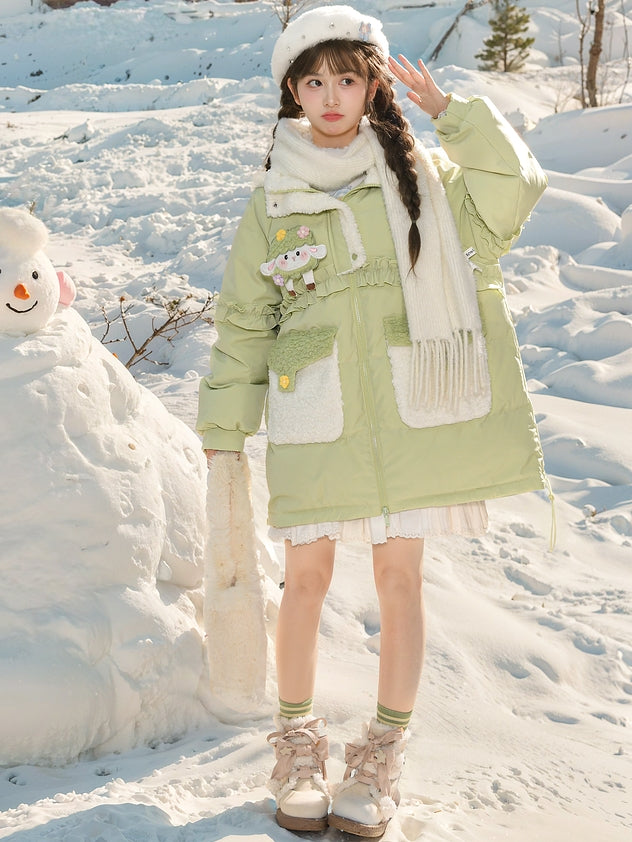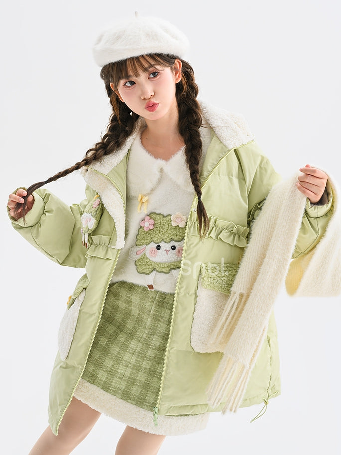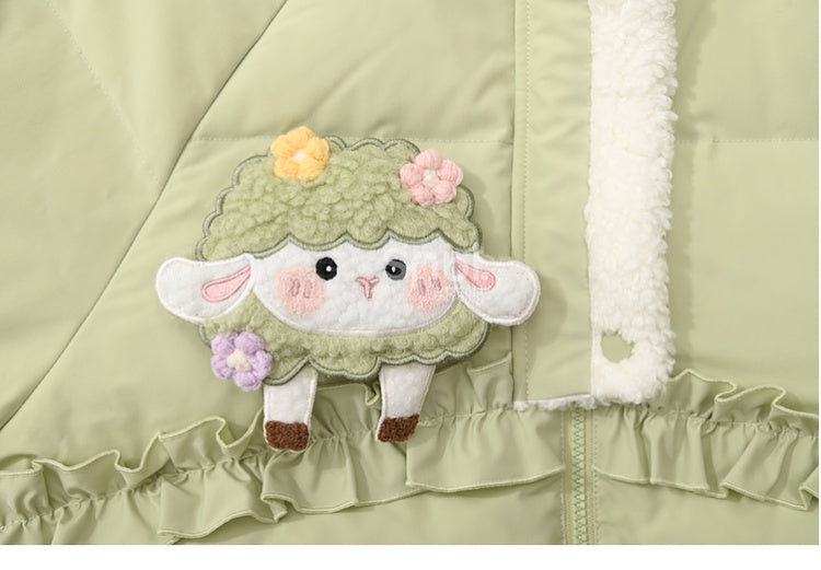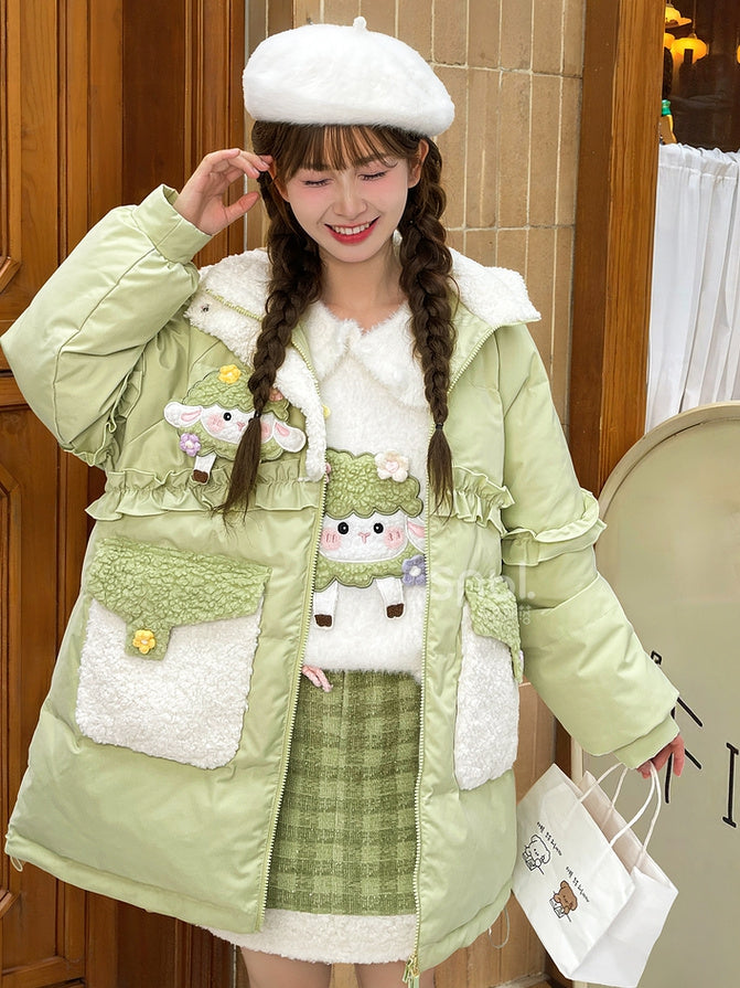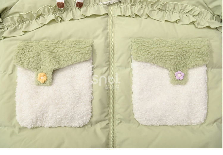Bleiben Sie warm und stilvoll in unserem grünen Daunenmantel mit Kapuze und Rüschenbesatz! Das charmante Lamm-Design verleiht dem Mantel einen Hauch von Niedlichkeit, während die Kapuze und der Rüschenbesatz für zusätzliche Wärme und Eleganz sorgen. Perfekt für kühle Tage – dieser Mantel hält Sie kuschelig und bezaubernd.