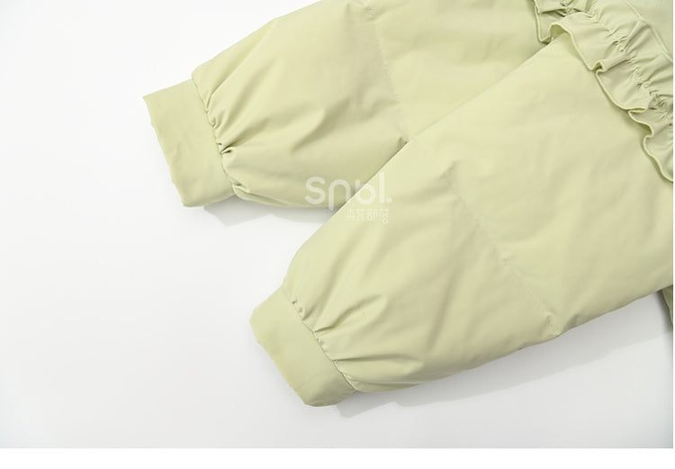 Grüner süßer Daunenmantel mit Kapuze und Rüschenbesatz