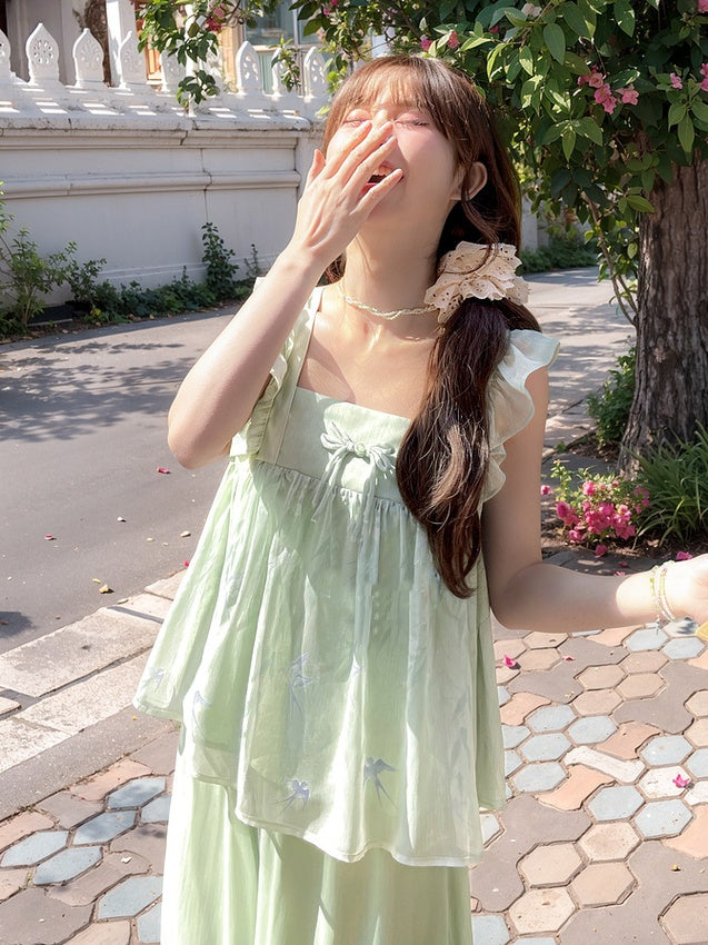 Grünes Chiffon-Tanktop im Cheongsam-Stil mit Flatterärmeln und Schwalbenmuster