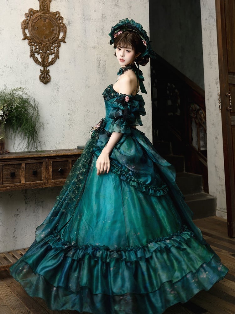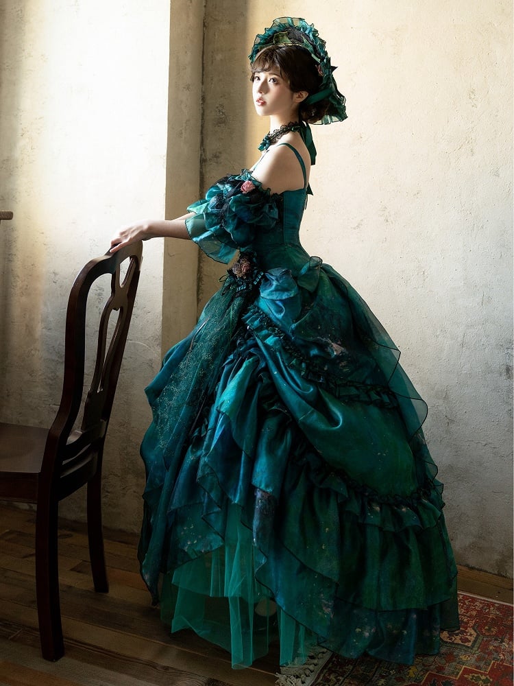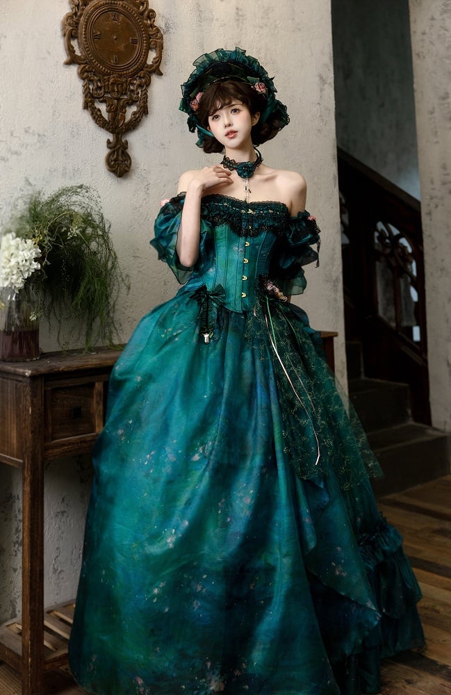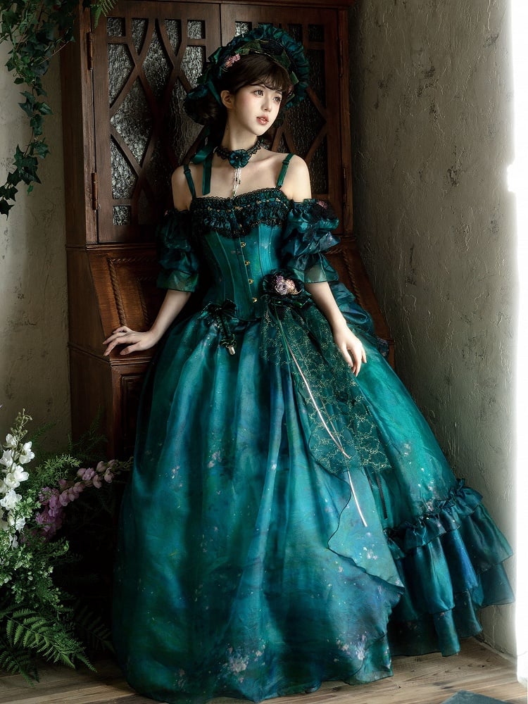 Grüner Waldfee-Lolita-Rock mit asymmetrischem Ölgemälde-Design und floraler Haarspange