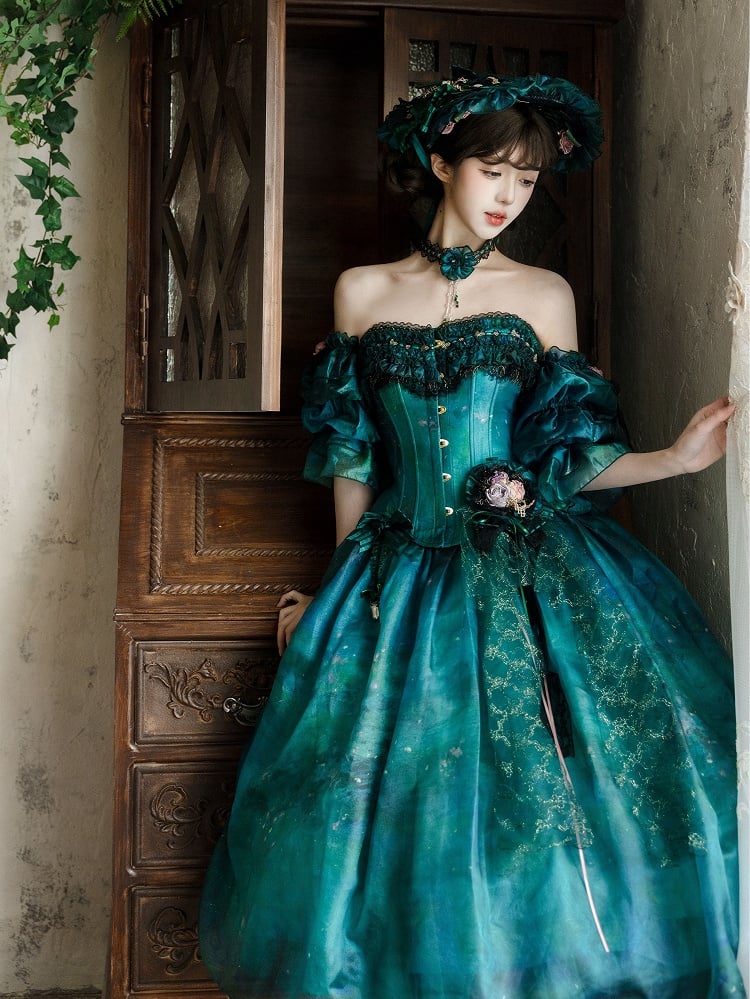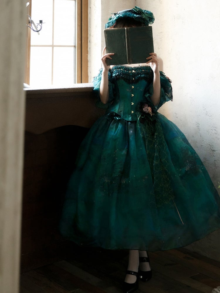 Grüner Tüllrock mit Waldfee-Lolita-Ölgemälde-Print und floraler Haarspange