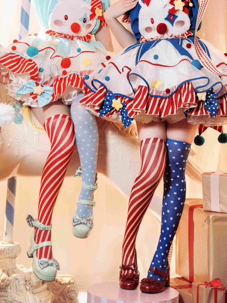 Dunkelblaue und rote / grüne und orange Zirkusstrümpfe