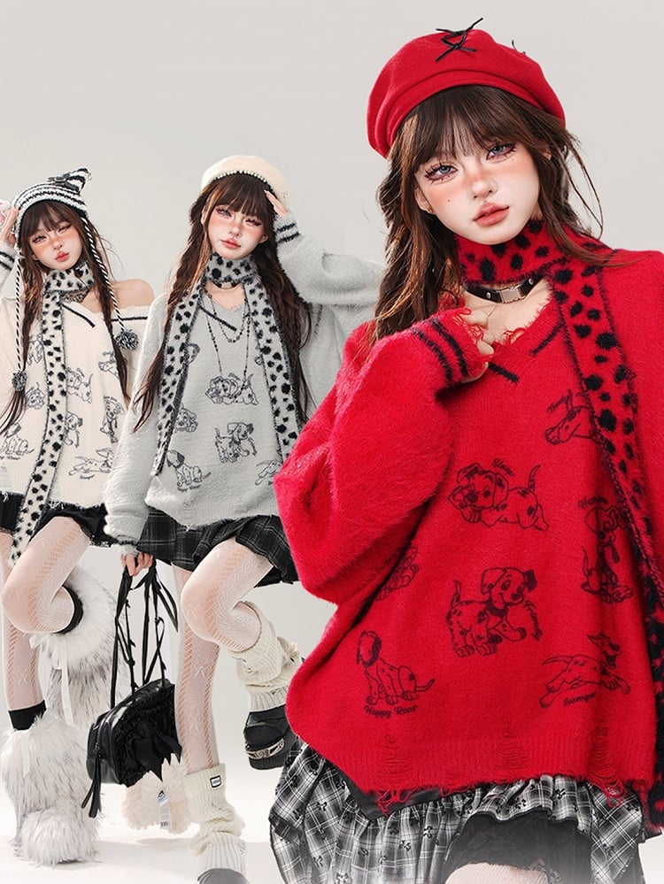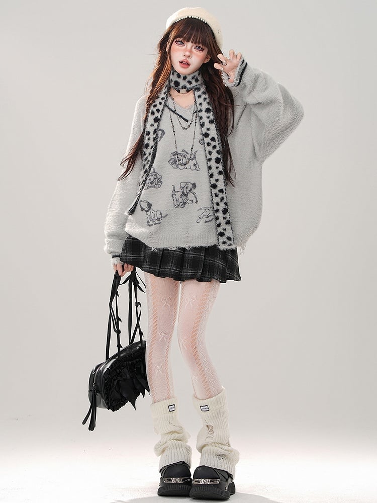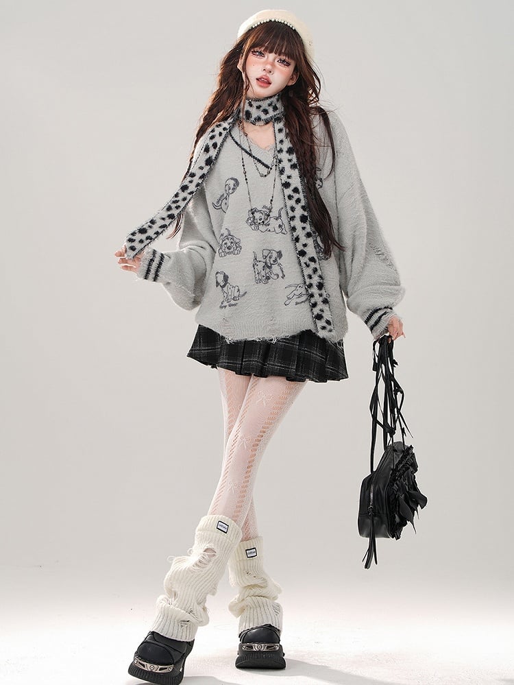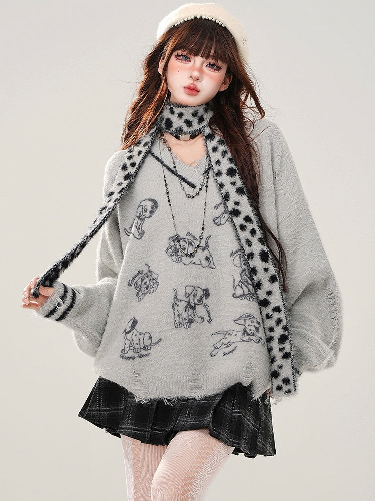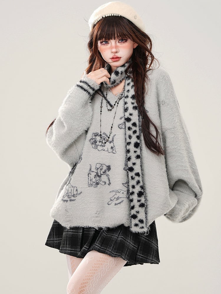 Dieser entzückende, lockere Pullover mit V-Ausschnitt von Grey Puppies wird mit einem kuscheligen Schal geliefert! Bleiben Sie warm und stilvoll mit unserem süßen Design, perfekt für Hundeliebhaber.