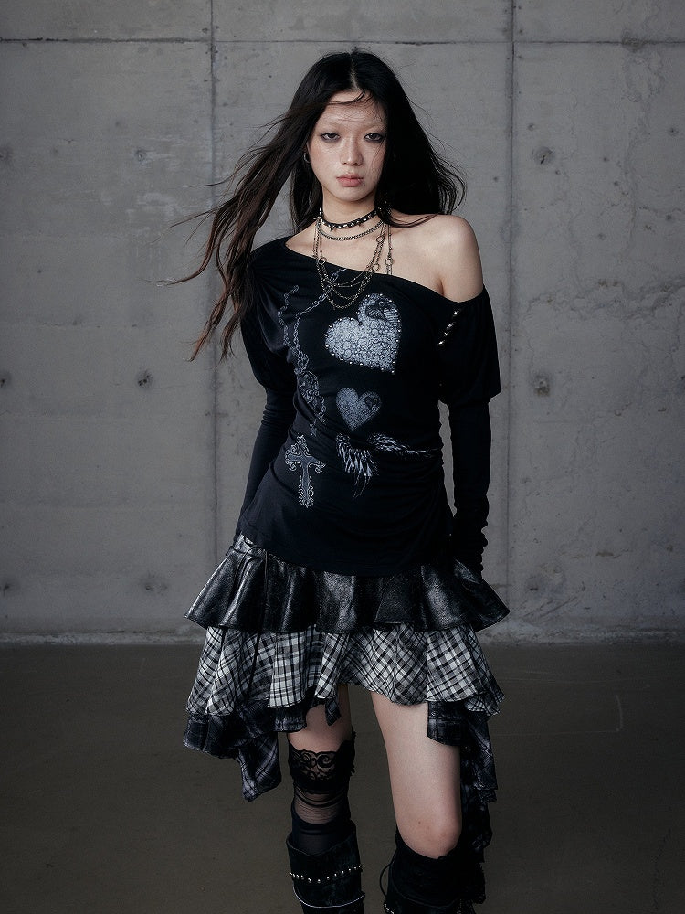 Grunge Ästhetischer Hals Punk Schwarz Seitliche Stretch-Knopfdetails Asymmetrisches Top mit