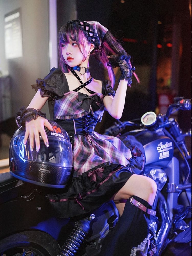 Lila kariertes einteiliges Idol-Kleid mit Neckholder und Schnürdetails
