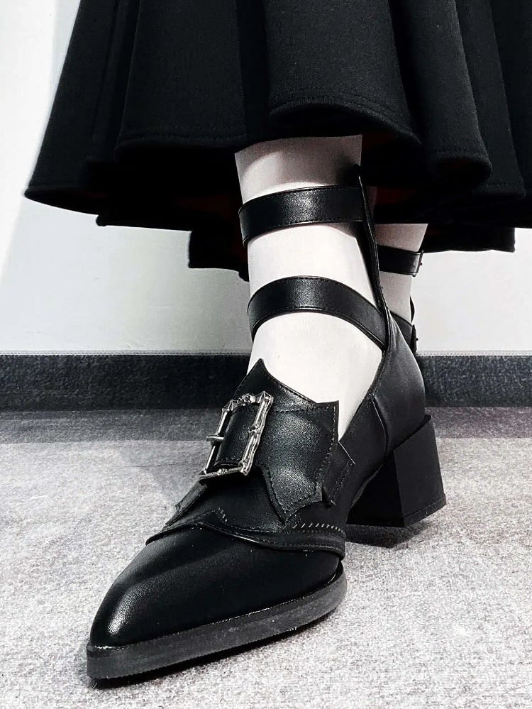 5cm Heeled Matte Black Pointed-toe Gothic Shoes - Bat Wing Bow & Buckle Details