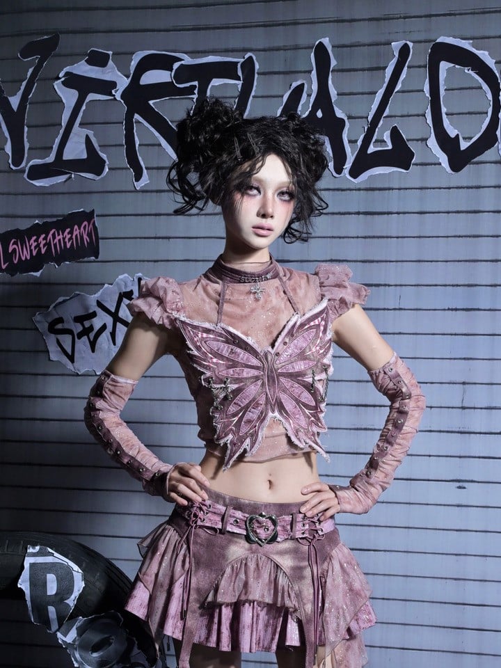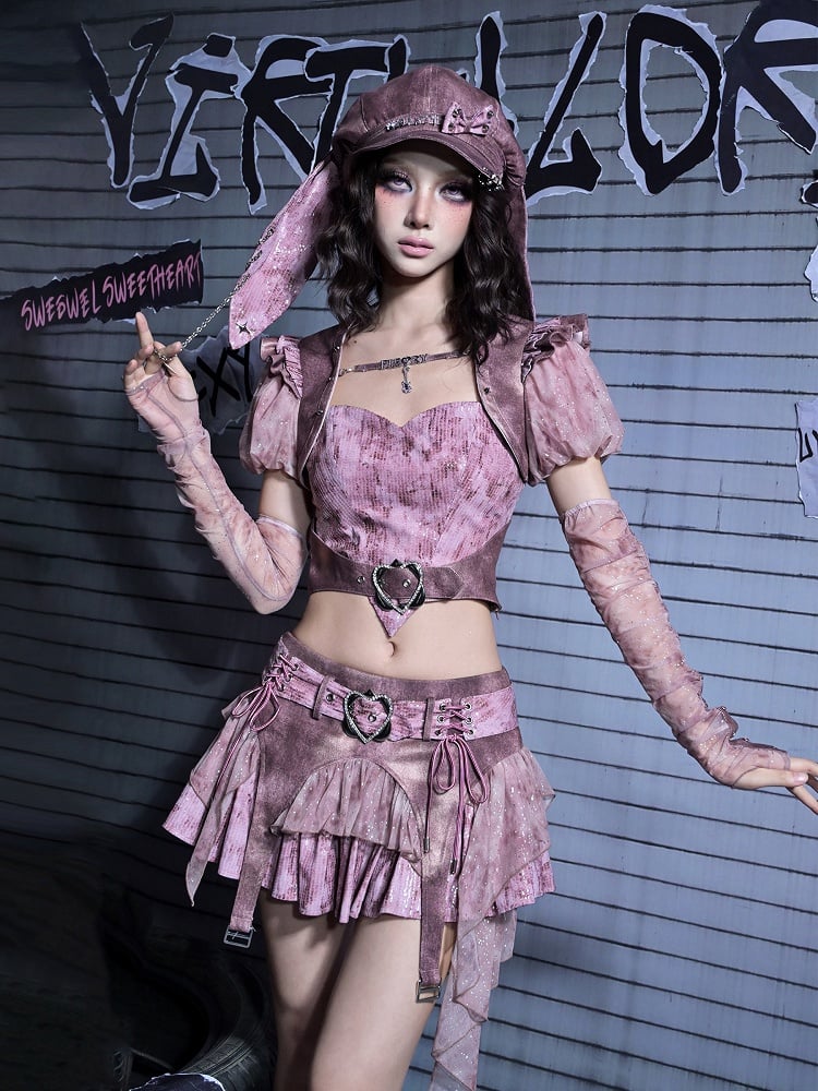 Y2K Punk Pink Denim Mini Skirt with Asymmetric Hem & Heart Buckle Sequined Belt