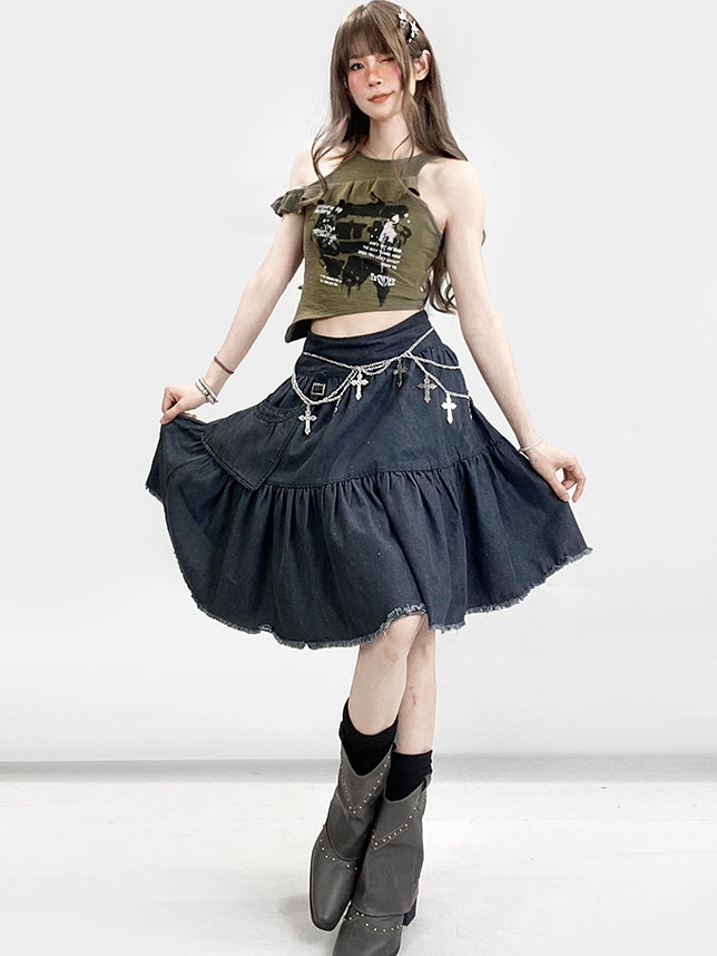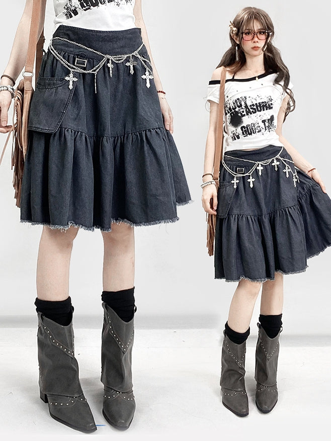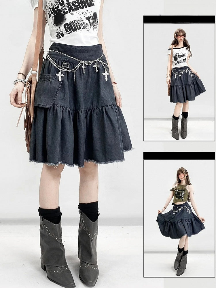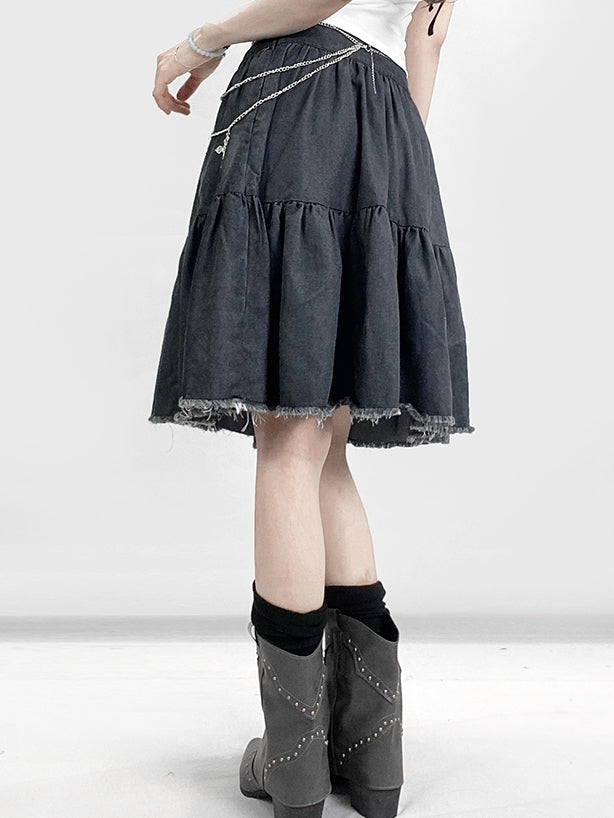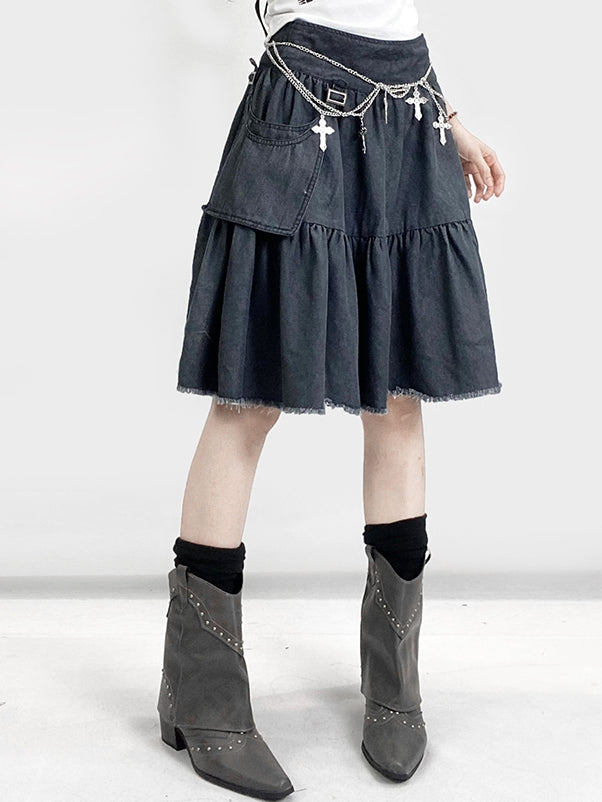 Dunkelgrauer, bittersüßer Rock mit rohem Saum und Taschendekor