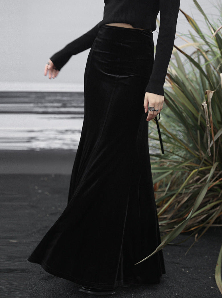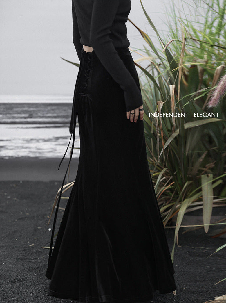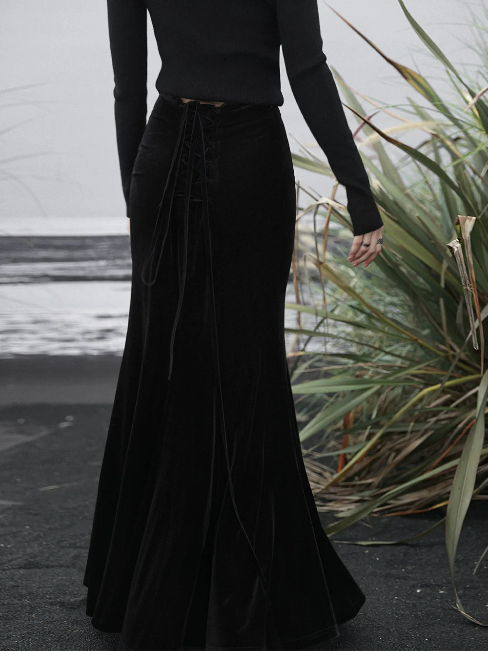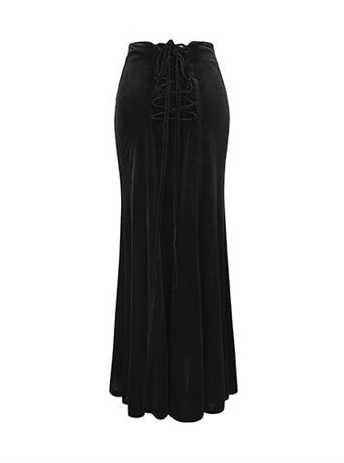 Hohe Meerjungfrau Samt Schwarz Taille Rock Retro Zurück Lange Up Spitze