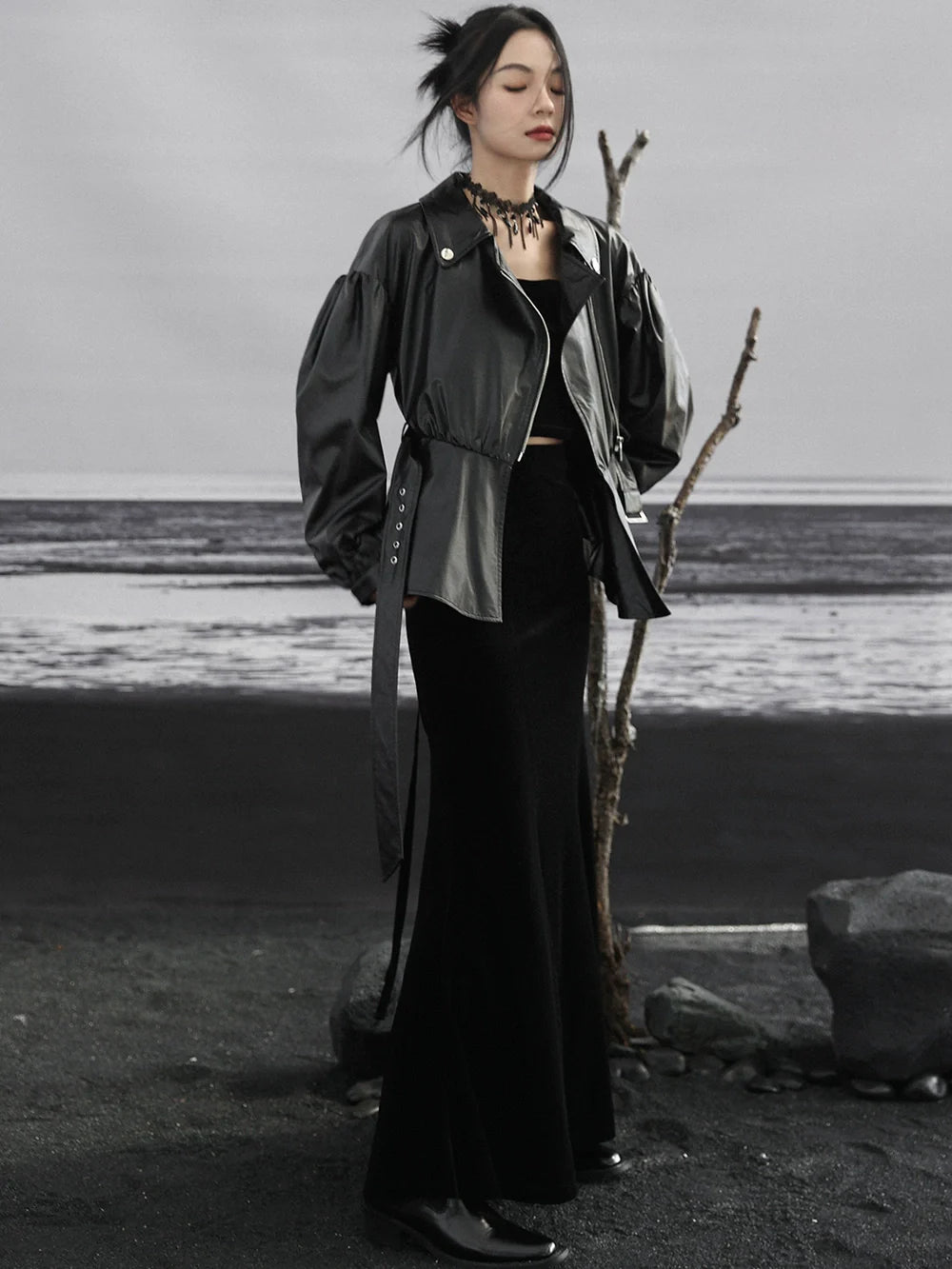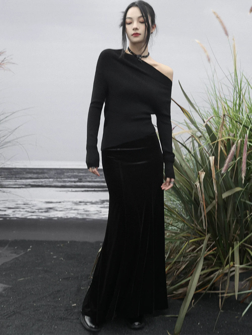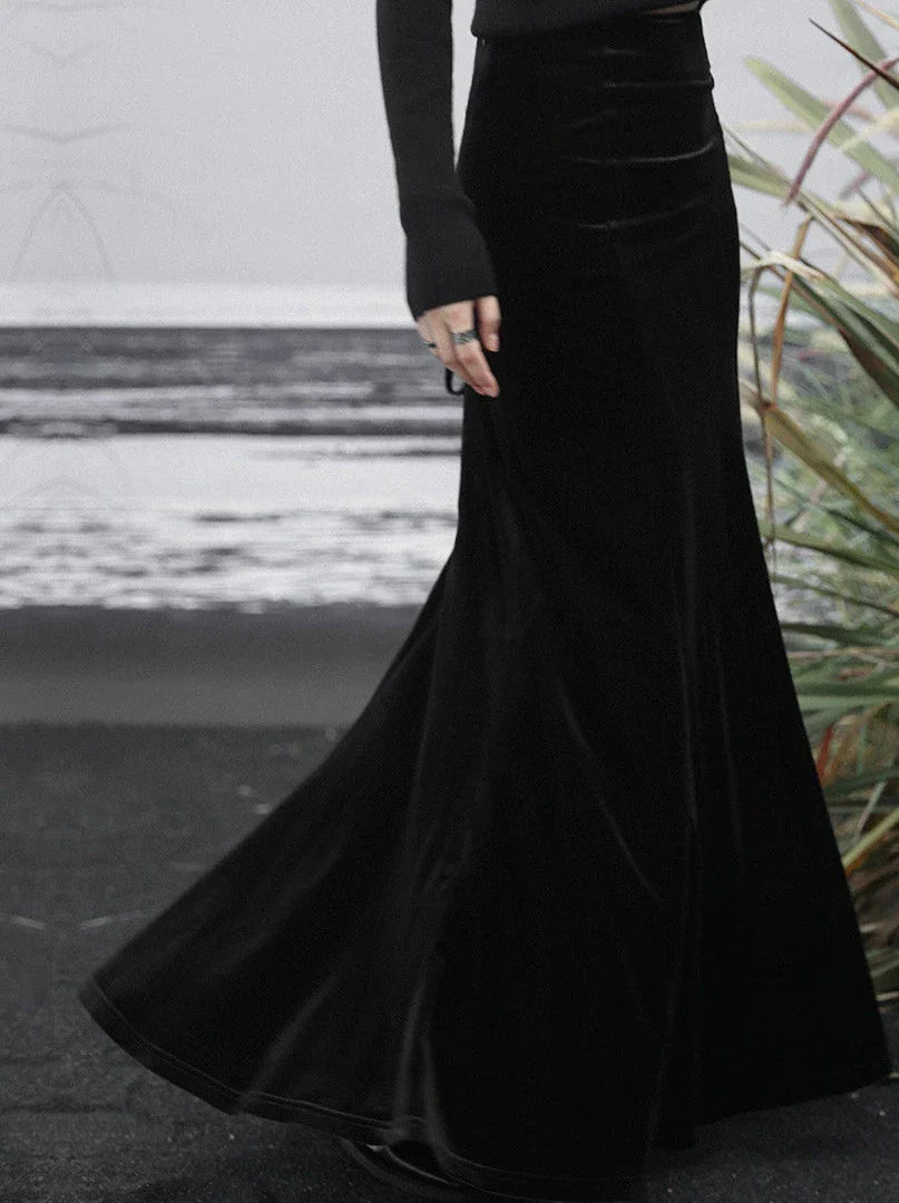 Hohe Meerjungfrau Samt Schwarz Taille Rock Retro Zurück Lange Up Spitze