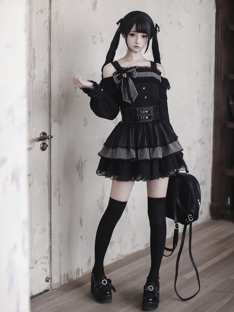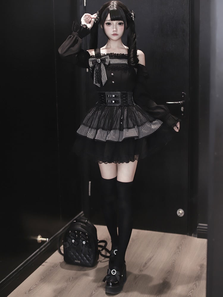High-Waist / Kei Black Skirt Sweet Jirai Dark Striped Tiered Top Off-Shoulder