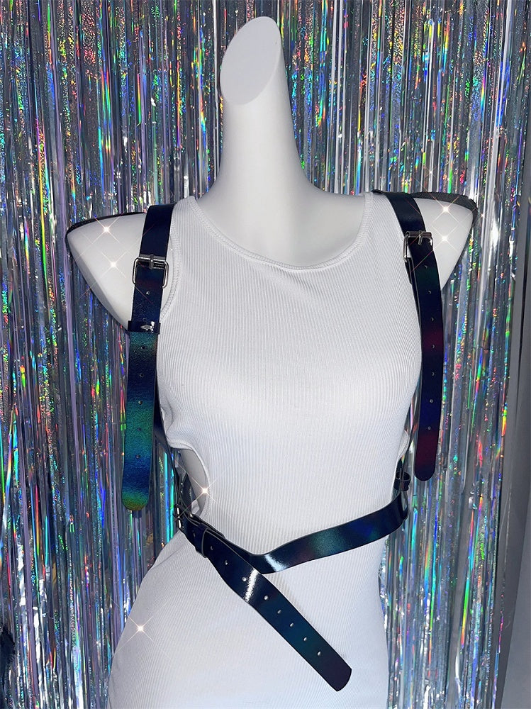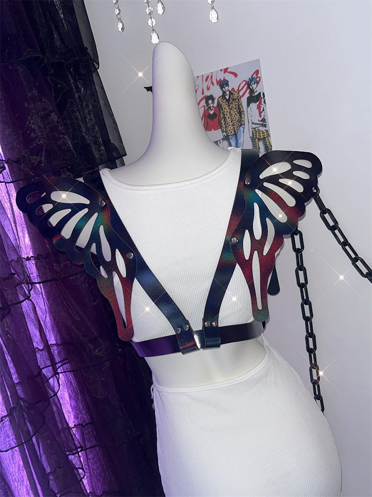 Dieser bezaubernde Harnessgürtel mit Schmetterlingsflügeln in holografischer Farbe und Schwarz verleiht jedem Outfit einen Hauch von Verspieltheit. Die holografischen und schwarzen Schmetterlingsflügel sind stilvoll und funktional zugleich und sorgen dafür, dass Ihre Habseligkeiten sicher verstaut sind. Vervollständigen Sie Ihren Look mit diesem süßen und praktischen Accessoire.