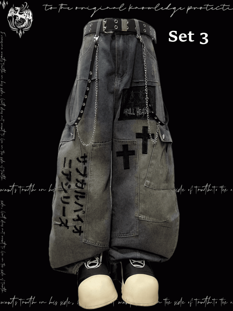 Jeans Blue Cross Applique Wasteland Punk Distressed Weites Bein Cargo