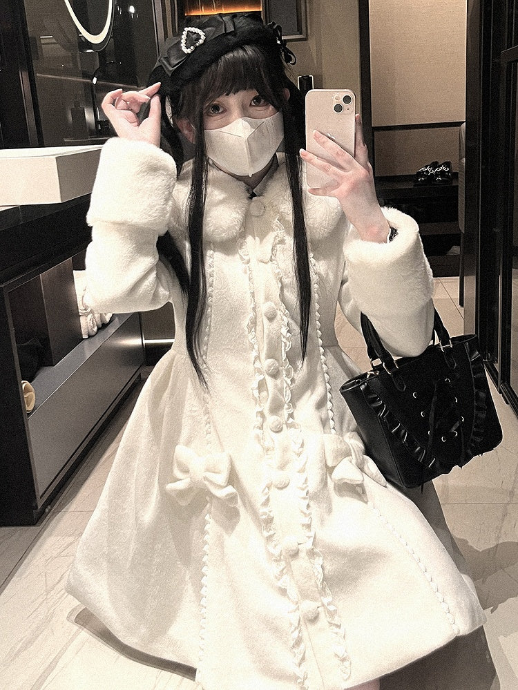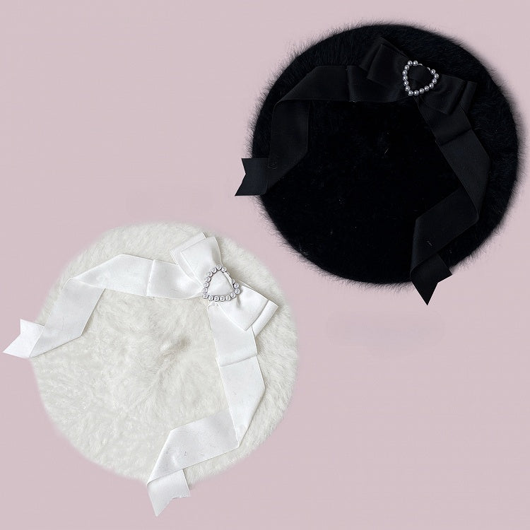 Jirai Kei Schwarz/Weiße Plüschbaskenmütze mit Schleifendetails