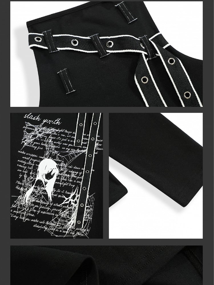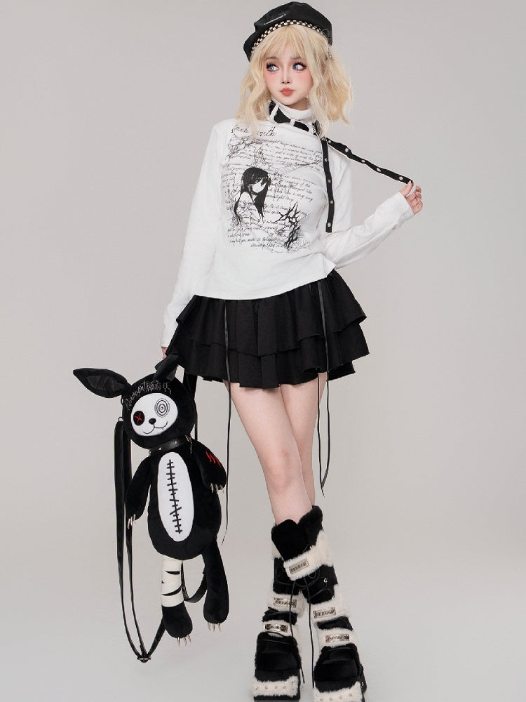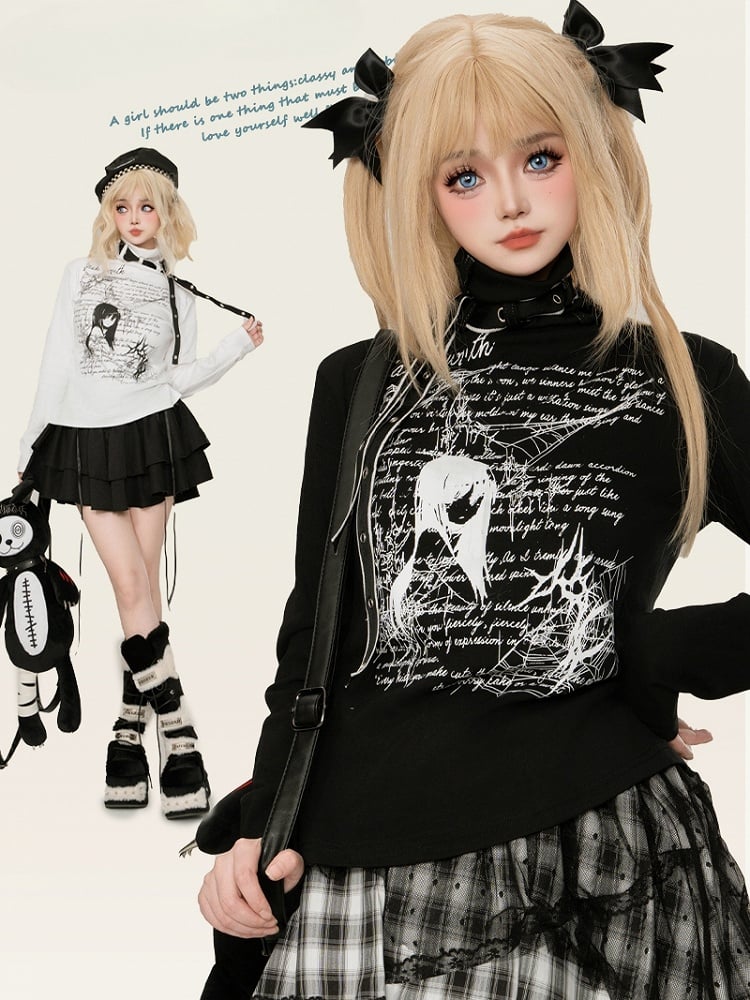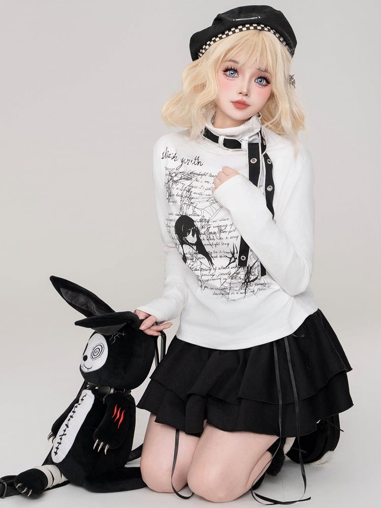 Jirai Kei Schwarz/Weißes Manga-Girl-Oberteil mit Trägerdetails und hohem Halsausschnitt