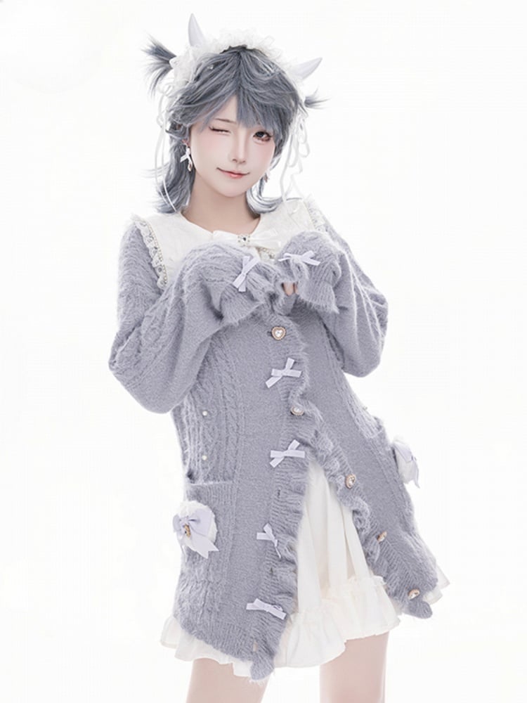 Jirai Kei – Weiche Strickjacke im Landminen-Stil mit grauen Schleifenakzenten