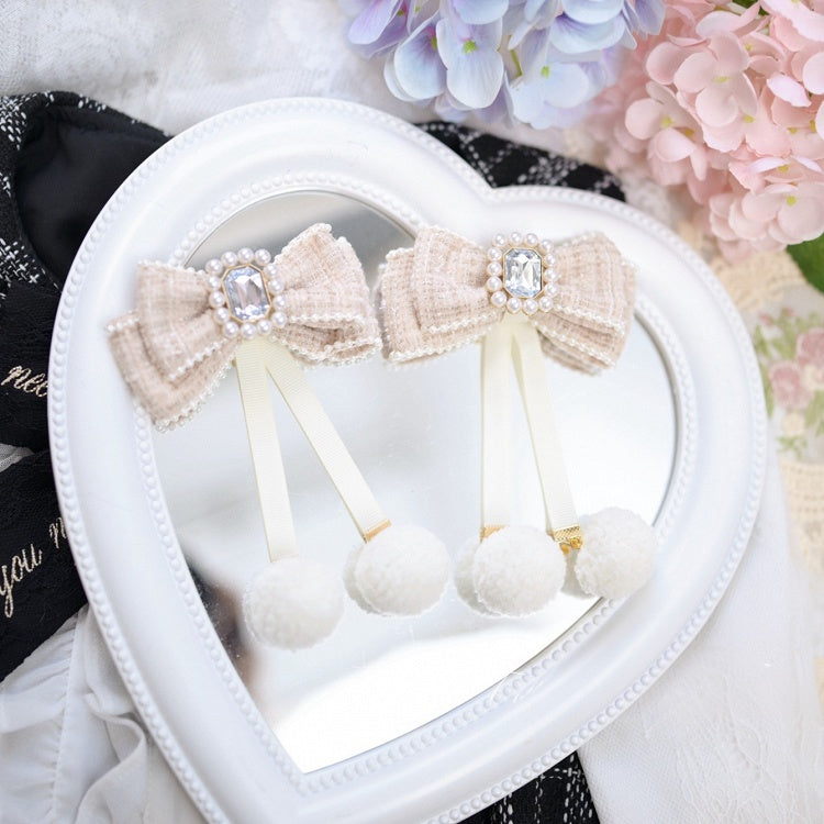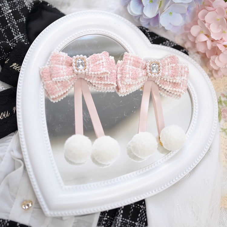 Jirai Kei Hellblaue Haarspangen aus Tweed mit Perlen und Schleife und Pompon-Details
