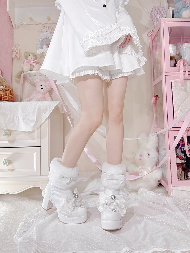 Jirai Kei – Mattweiße Strassschleife oben – Plateau-High-Block-Absätze mit Plüschmanschette und Perlenkette