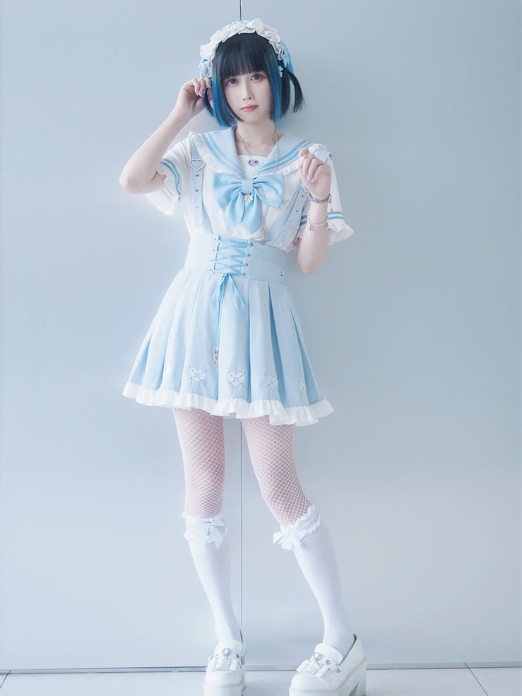 Blau-weißes Old School Lolita Fashion Kleid mit Schleife und Details, JSK-Set