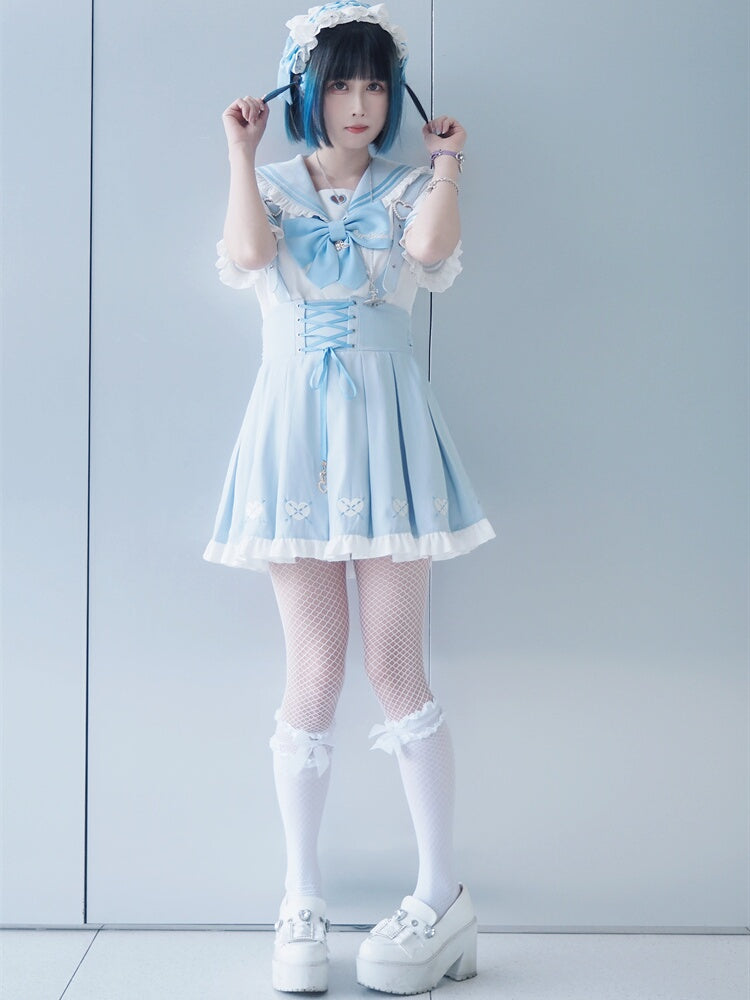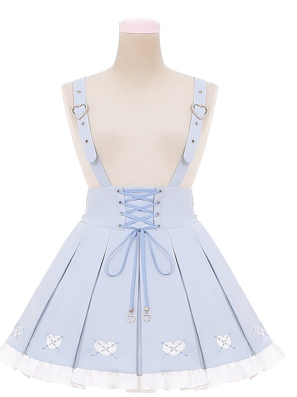 Jirai Kei Overalls Hellblau Herz Stickerei vorne Schnürung