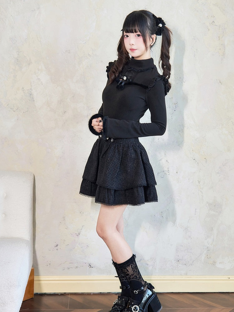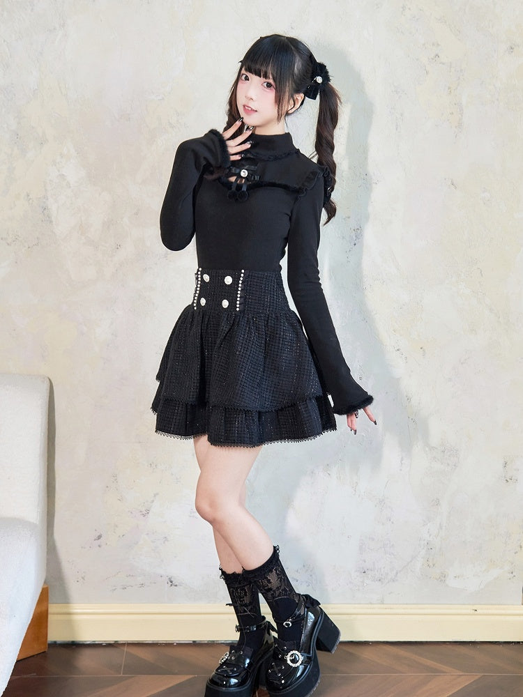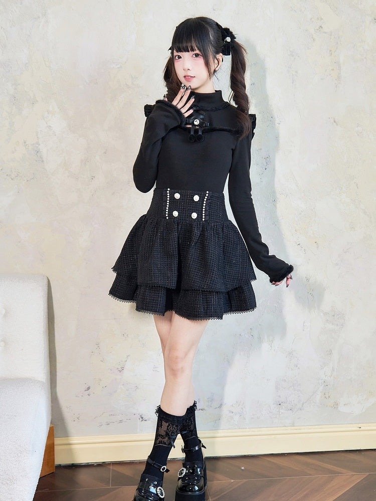 Jirai Kei – Schwarzes Oberteil mit Plüschbesatz, Cut-Out-Detail, Schleife und Strassverzierung