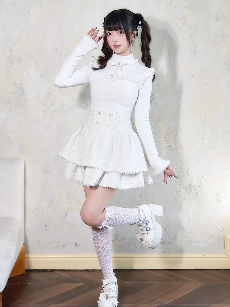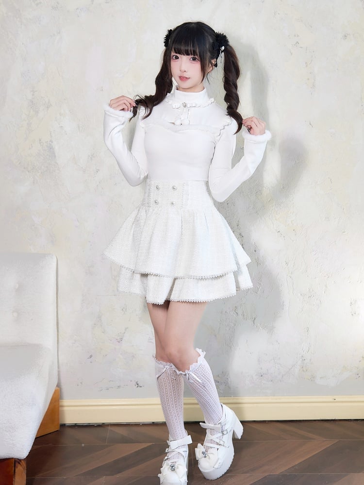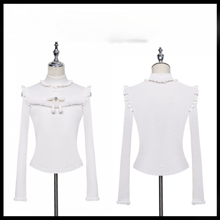 Jirai Kei – Weißes Oberteil mit Plüschbesatz, Cut-Out-Detail, Schleife und Strassverzierung
