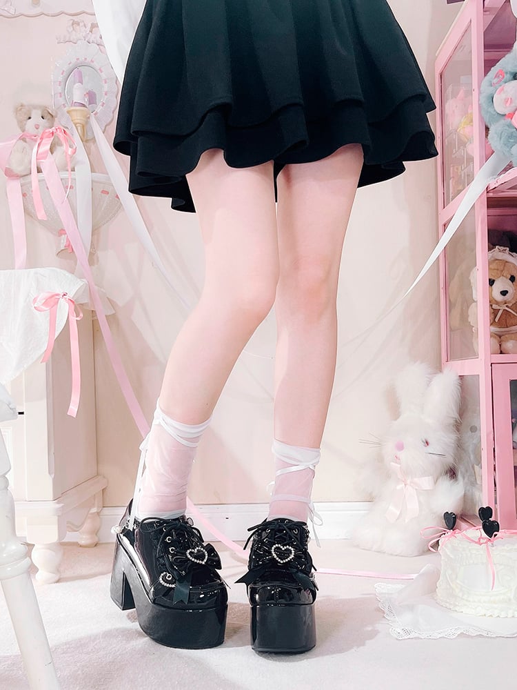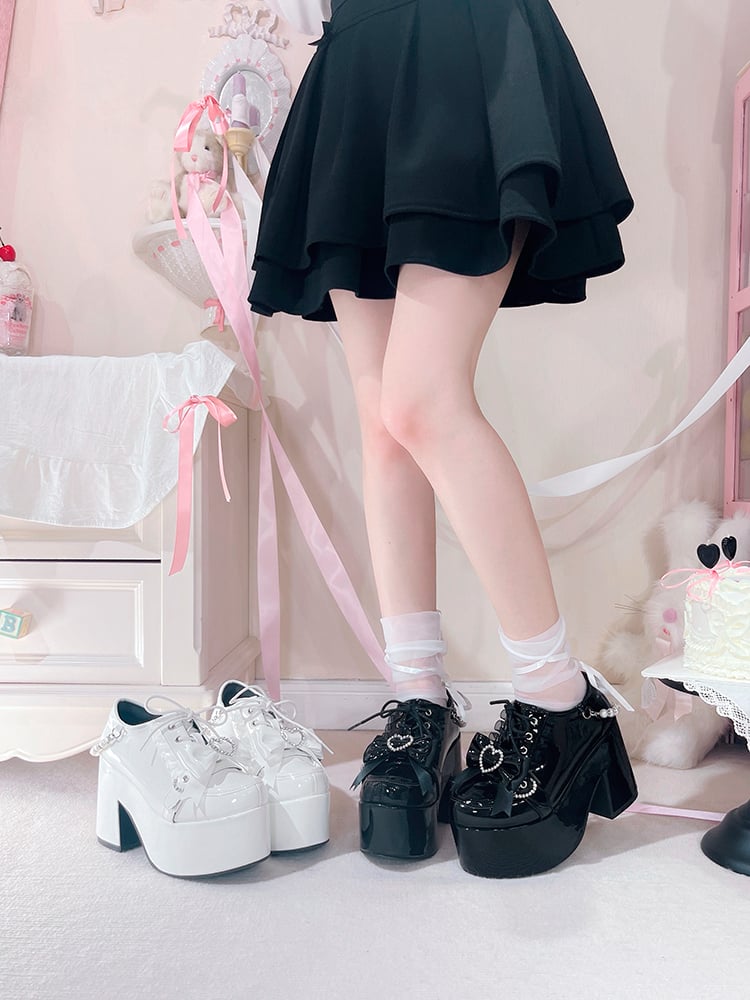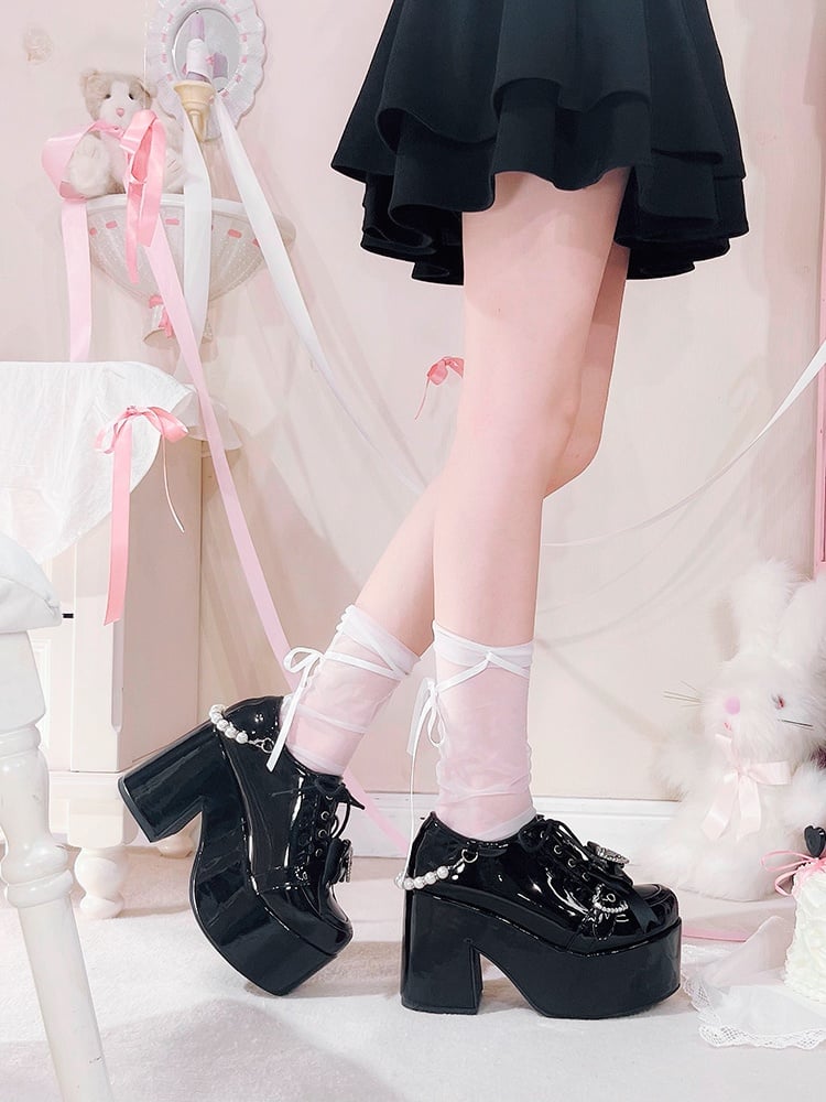 Jirai Kei – Hochglanz-Plateau-Absätze mit schwarzem Spitzenbesatz und Herzschleife und hohem Blockabsatz mit Perlenkette
