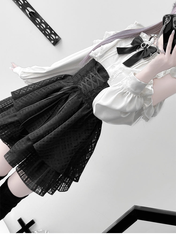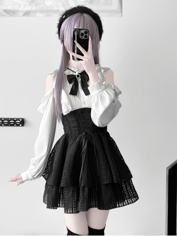 Jirai Kei-Set – Weiße Bluse mit Rüschenausschnitt und ausgeschnittenen Schultern + schwarzer Stufenrock mit Schnürung + große Schleife