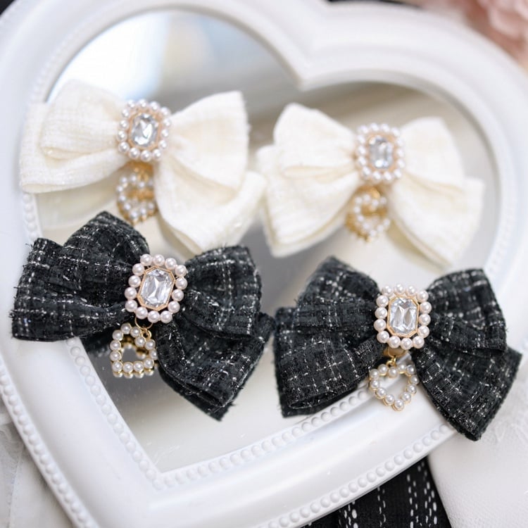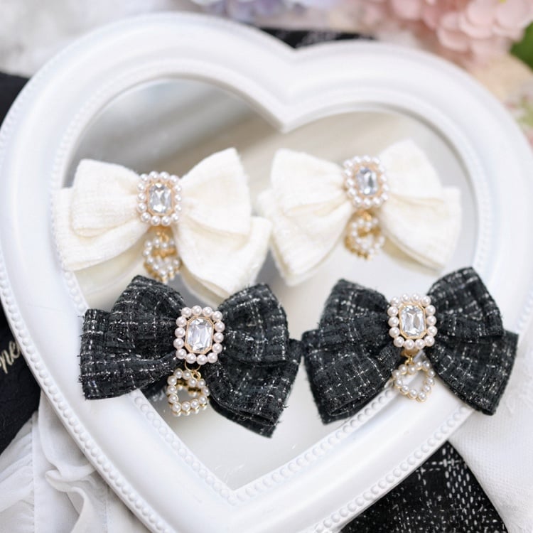Jirai Kei – Haarspangen mit Herzschleife und Strasssteinen in Weiß/Schwarz