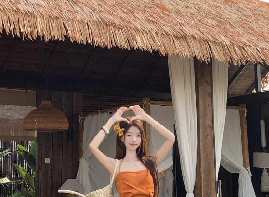 Knotenwickel-Krawatten-Fit / Mittelschmal geschnittenes Maxi-Camisole mit Neckholder und A-Linien-Oberteil und Rock, einfarbig, gefärbt
