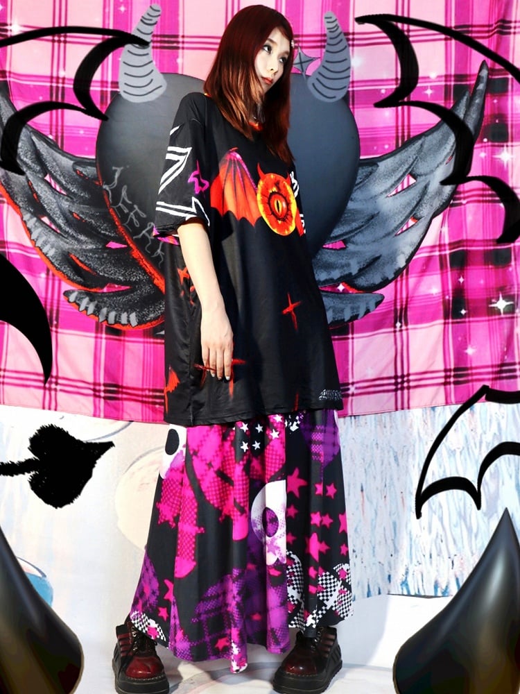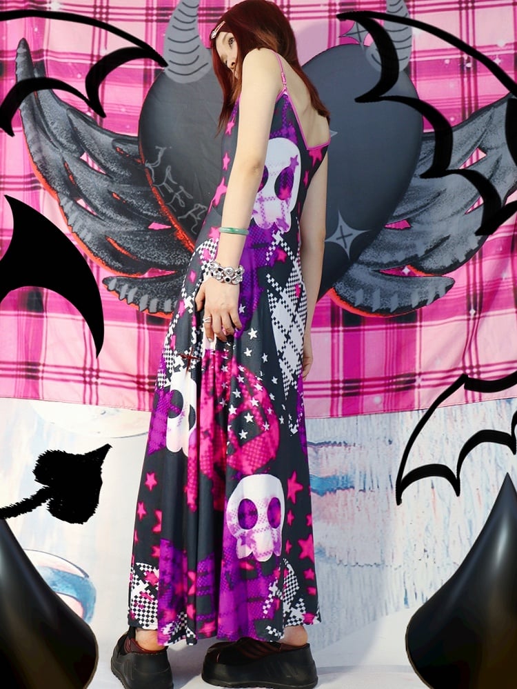 Kuro Kawaii Schwarzes Camisole-Kleid mit Skelett- und Sternenmuster und Karo-Herzmuster